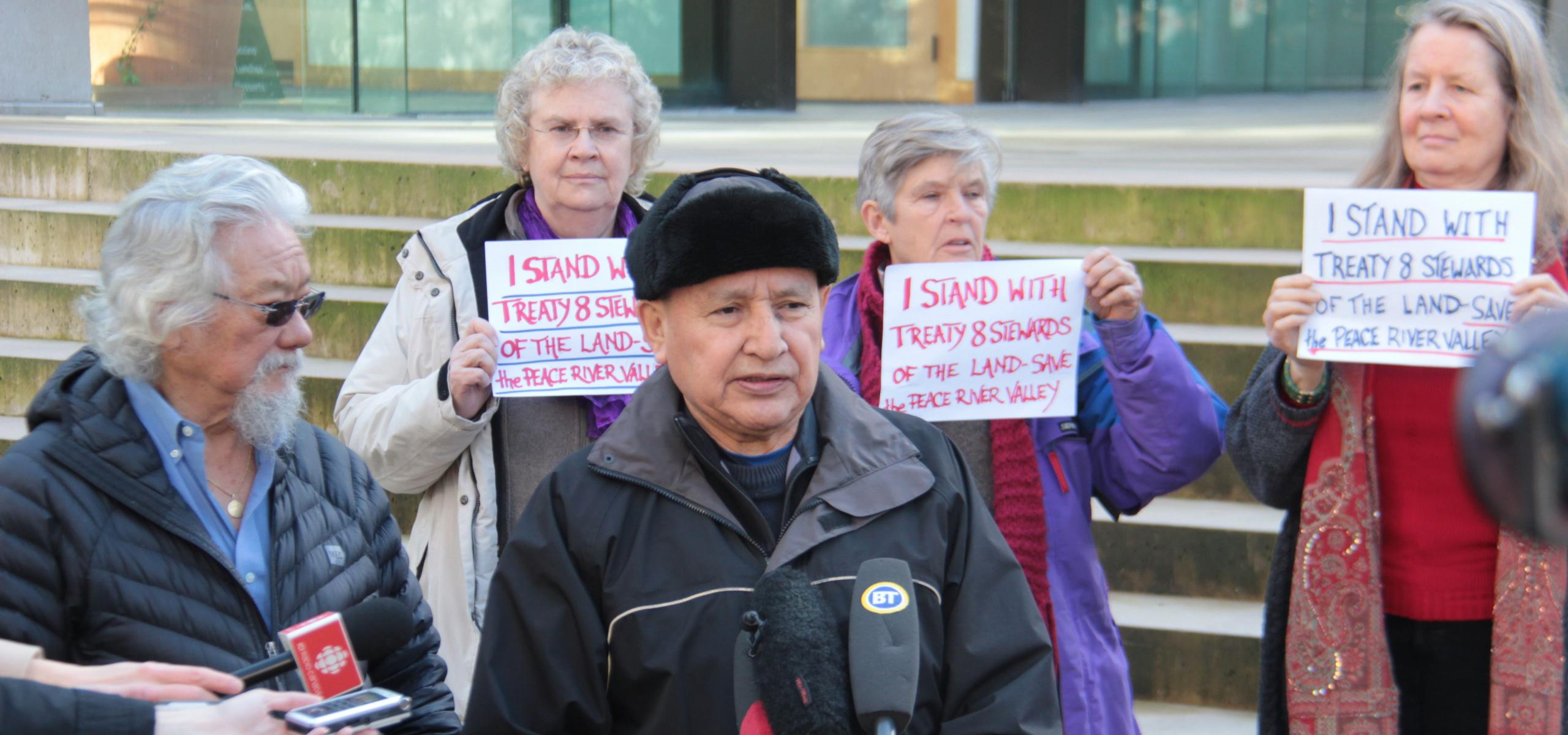 Photo: David Suzuki and Grand Chief Stewart Phillip supporting Site C protestors outside Supreme Courts (Joe Foy)