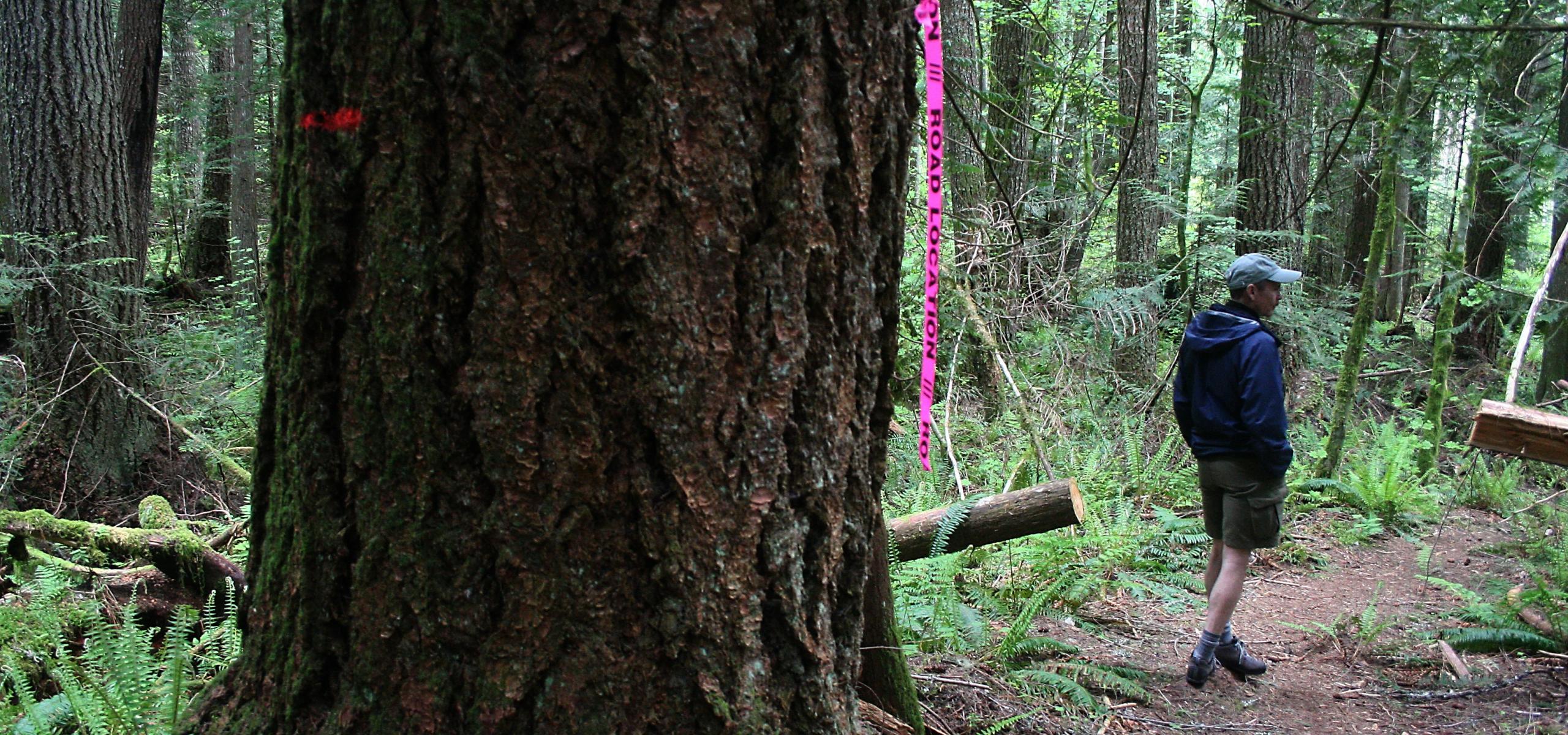 Photo: Tree marked for future logging road location in Chilliwack Valley spotted owl wildlife habitat area