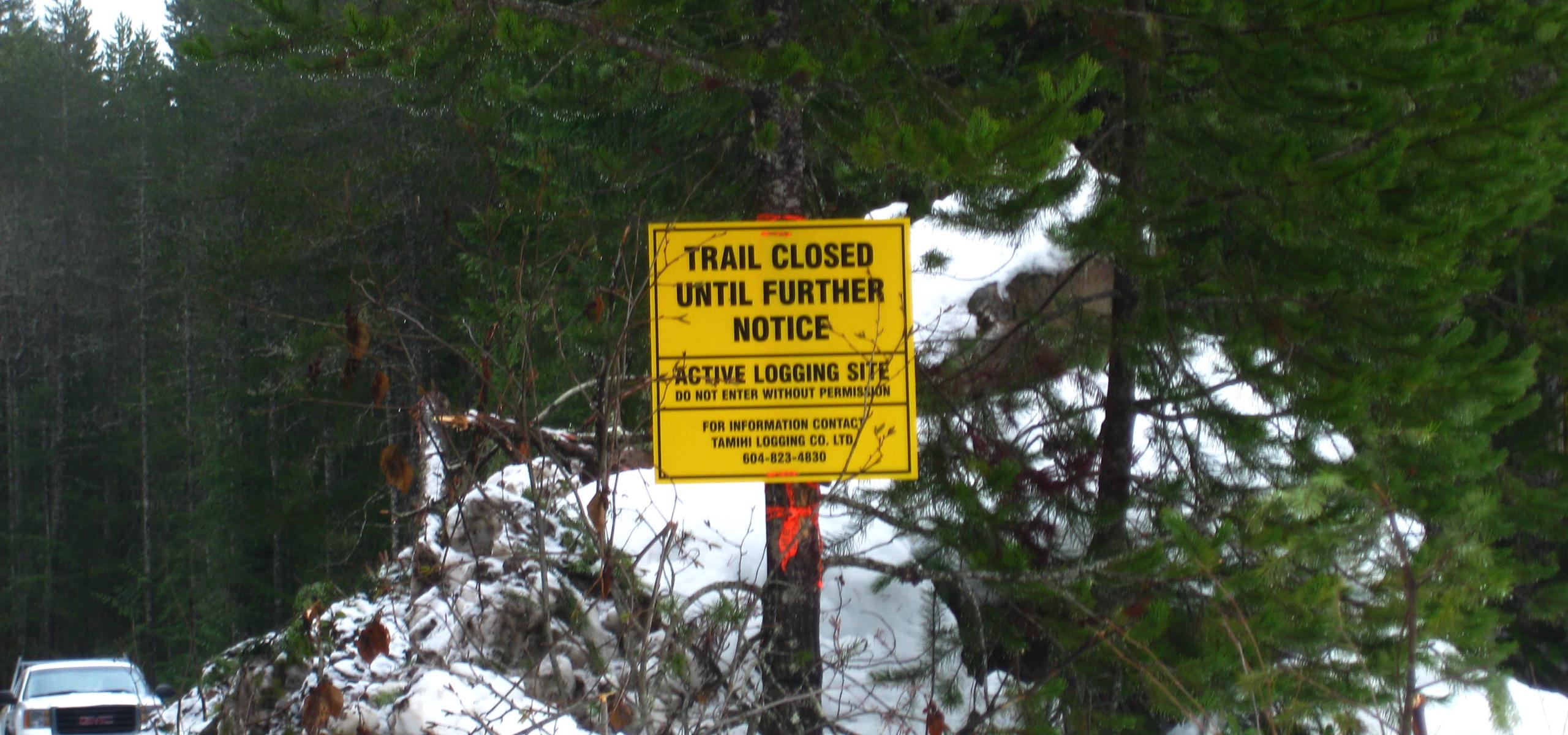Photo: Sign indicates trail closure by logging company in the Chilliwack Valley spotted Owl Wildlife Habitat Area