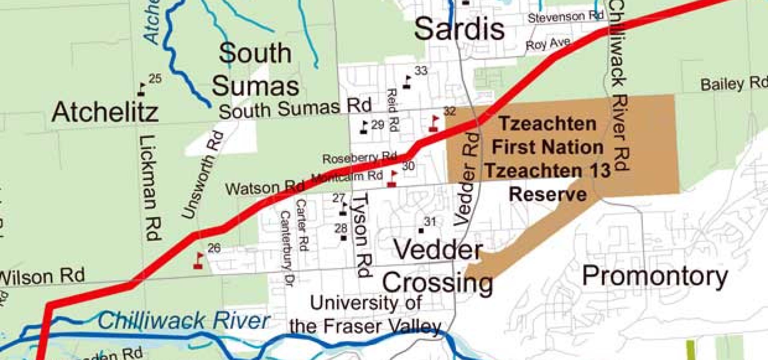 Photo: The red line shows the route of the Trans Mountain oil pipeline through Chilliwack near schools