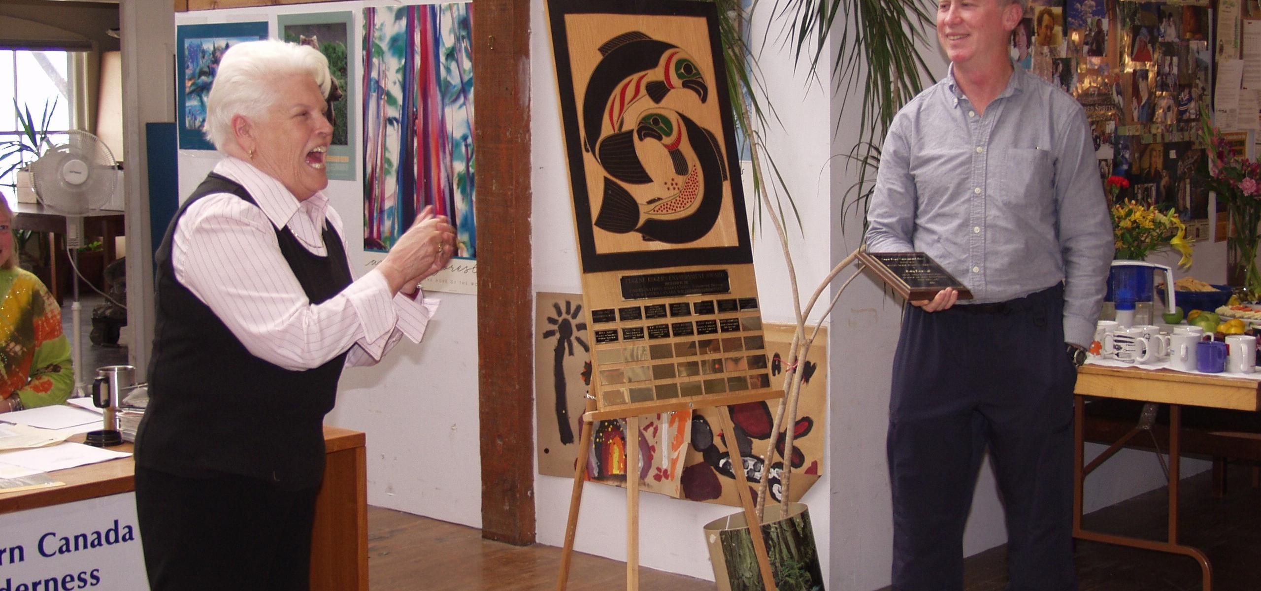 In memory of Eugene Rogers and the tradition of hard work he brought to the conservation movement, the Wilderness Committee presents the Eugene Rogers Award annually to a conservationist who has worked exceptionally hard to protect nature and who has made an outstanding contribution towards protecting wilderness and fish habitat. The award is in the form of a plaque, and it is accompanied by a $1,000 prize. The recipient's name is also placed with former recipients on a wood carving of spawning salmon by Salish artist William Watt that hangs in the Wilderness Committee offices.