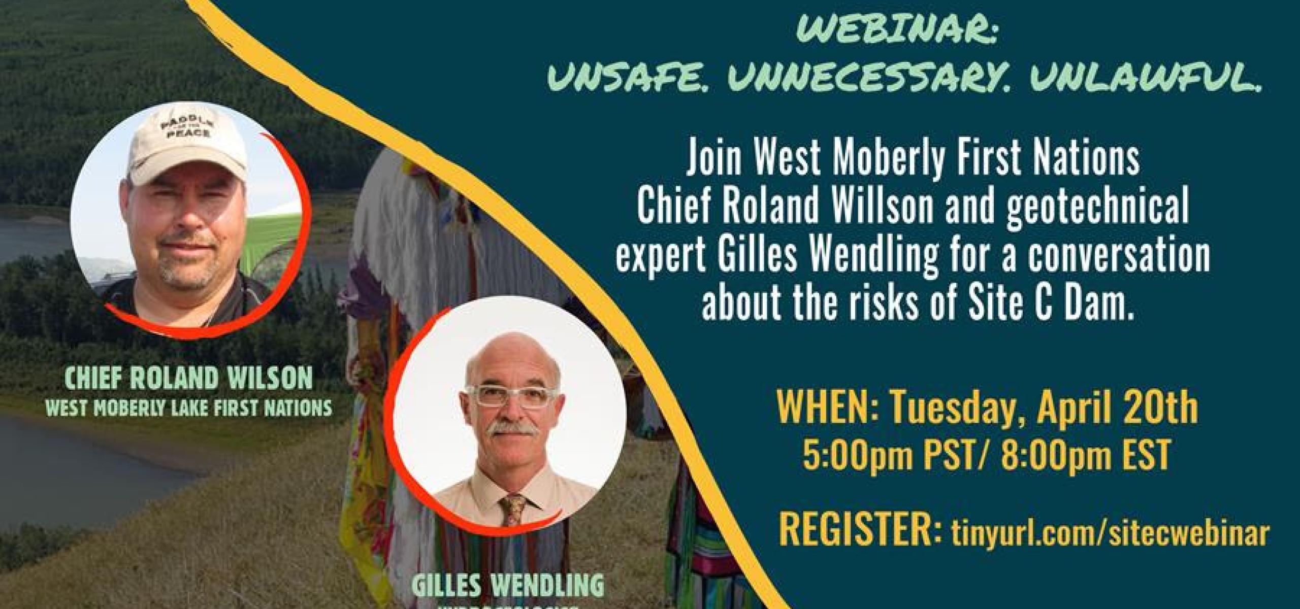 Join West Moberly First Nations Chief Roland Willson, together with geotechnical expert Gilles Wendling for a conversation about the risks of Site C Dam, and the rationale behind the campaign to stop the project based on assertion of Indigenous Treaty rights.