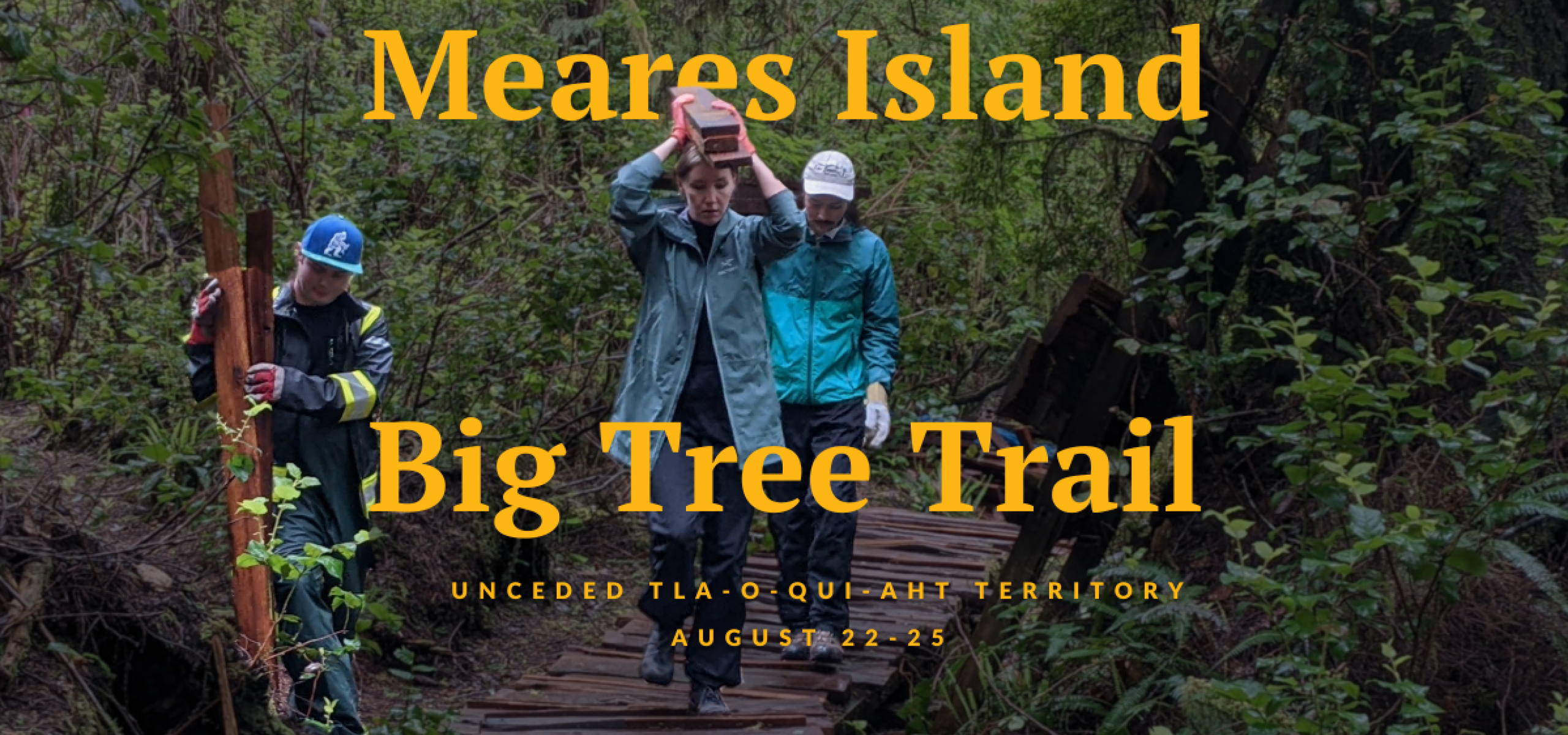 - Saturday: We will wake up and have breakfast, drive to the dock and take the water taxi to Meares between 8 and 9 a.m. We will hike, carry wood, build boardwalks and trim and clear undergrowth from the trail, with frequent breaks and a lunch break, and return to our campsite by dinner time.