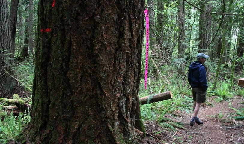 Photo: Tree marked for future logging road location in Chilliwack Valley spotted owl wildlife habitat area BC...
