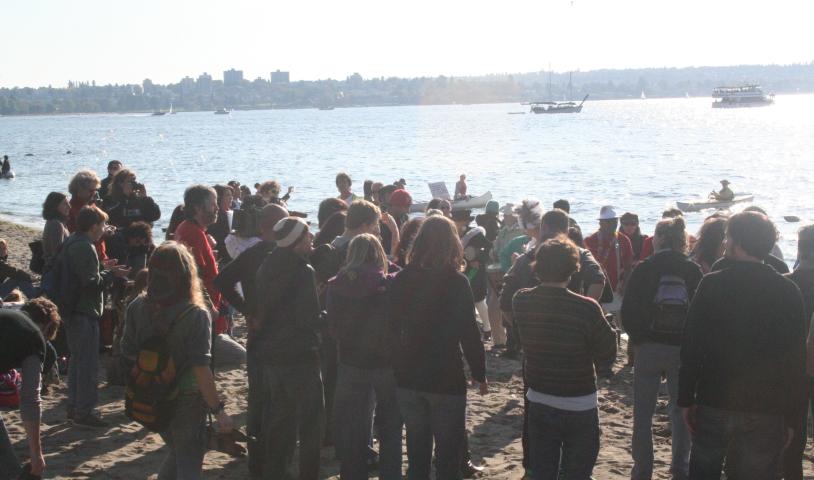 Hundreds gathered at Second Beach Sunday afternoon, and hundreds more filled boats and kayaks in Burrard Inlet, to...
