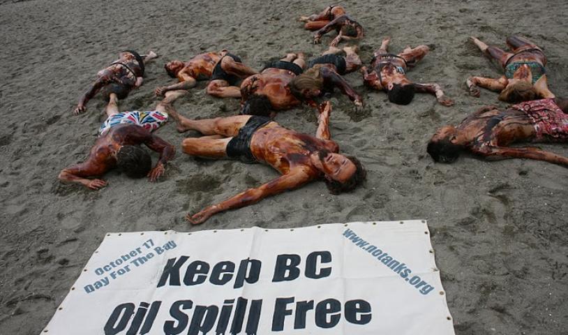 Anti-oil protesters staged a slick protest in Vancouver's English Bay Monday, dousing themselves in fake oil before...