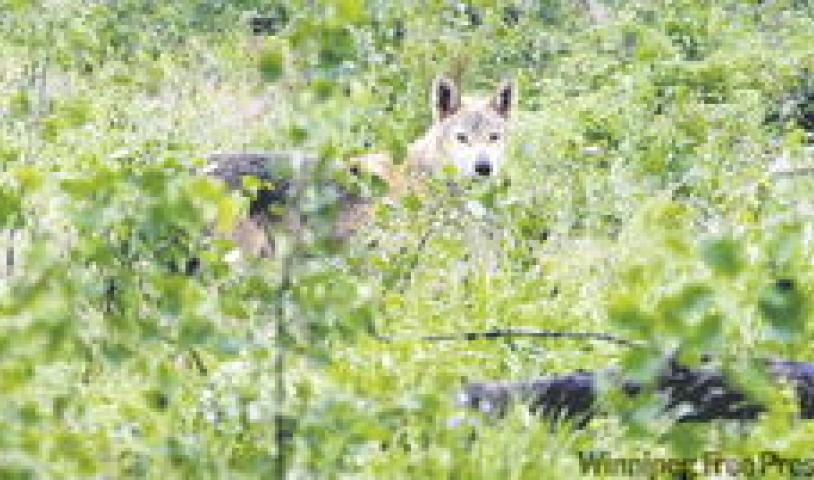 PHOTO: A timber wolf stares through the underbrush at Meditation Lake. (JOE.BRYKSA@FREEPRESS.MB.CA) Whiteshell park...