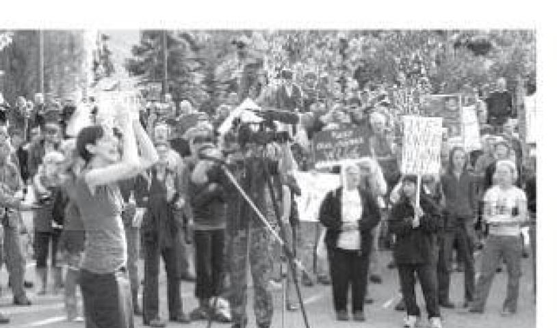 The West Kootenay EcoSociety’s Lee-Ann Unger leads protesters in a chant outside J.V. Humphries school in Kaslo at a...