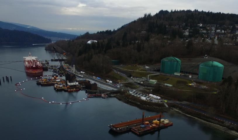 The ruling paves the way for Kinder Morgan to begin construction on the pipeline. Workers walk to a jet fuel barge at...
