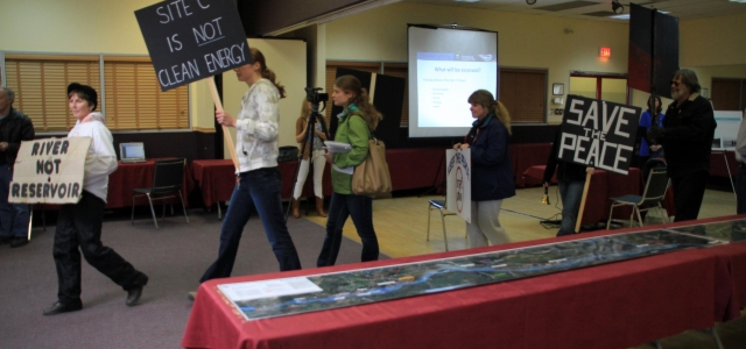 Once again, an information session about the proposed Site C dam was marked with a peaceful protest by the Peace Valley Environmental Association. This time the open house was held by the government, to inform the public about and gather feedback on the draft Environmental Impact Statement Guidelines.