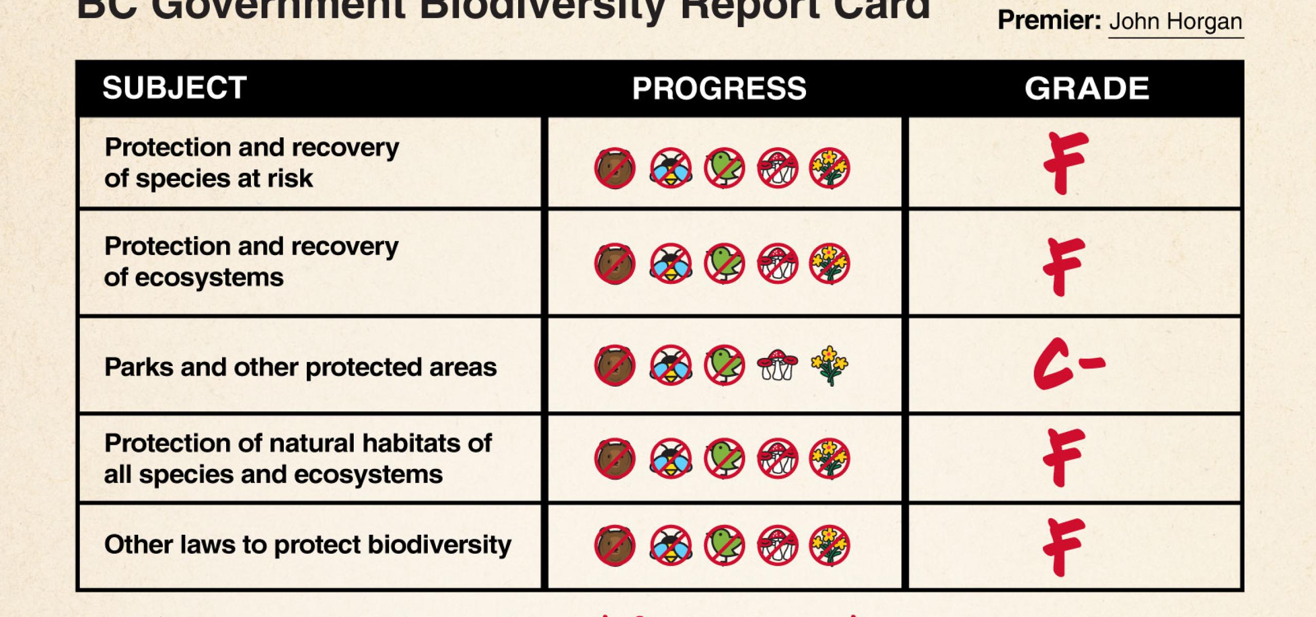 Ecojustice and Wilderness Committee assessed the province’s performance in five broad areas. All but one category received a failing grade: Protection and recovery of species at risk (Grade: F), Protection and recovery of ecosystems (Grade: F), Protection of natural habitats of all species and ecosystems (Grade: F), Parks and other protected areas (Grade: C -) and Other laws to protect biodiversity (Grade: F).