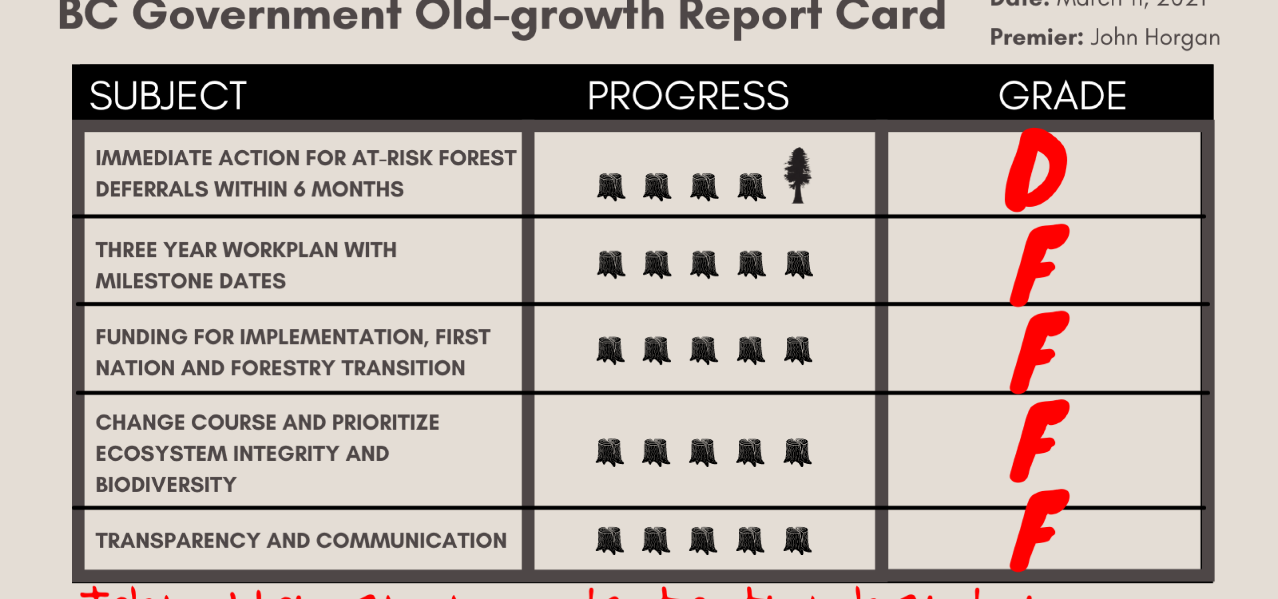 VICTORIA (Unceded Lekwungen Territories) — Ancient Forest Alliance, Sierra Club BC and Wilderness Committee issued a report card today assessing the B.C. government’s progress on protecting old-growth forests. Today marks exactly six months since the provincial government published the report from its independent old-growth panel. Premier John Horgan promised to implement the panel’s recommendations “in their totality” shortly after.