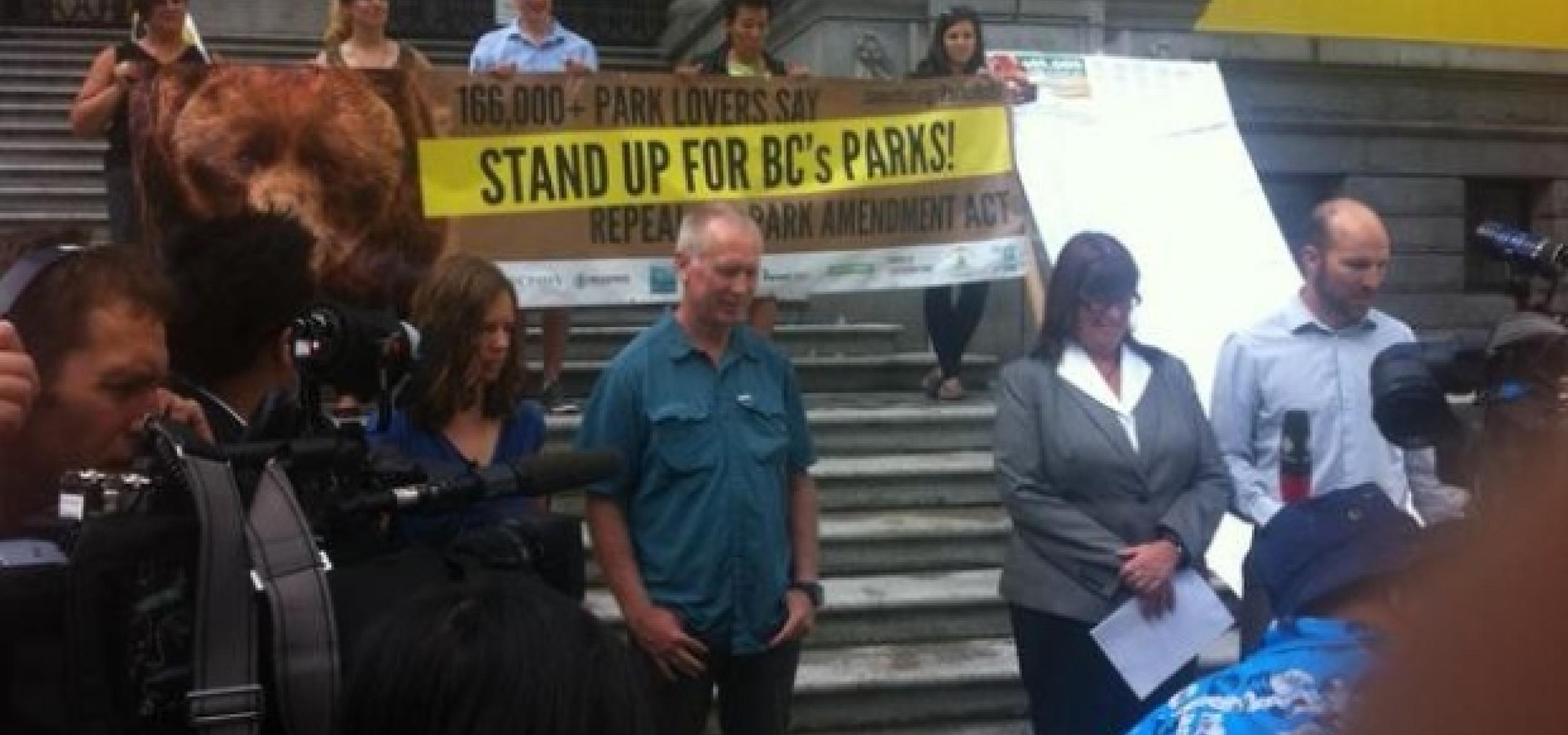 In Vancouver Friday, they unfurled a 167,000 name petition calling on the provincial government to repeal the Park Amendment Act, which was passed into law in May.
