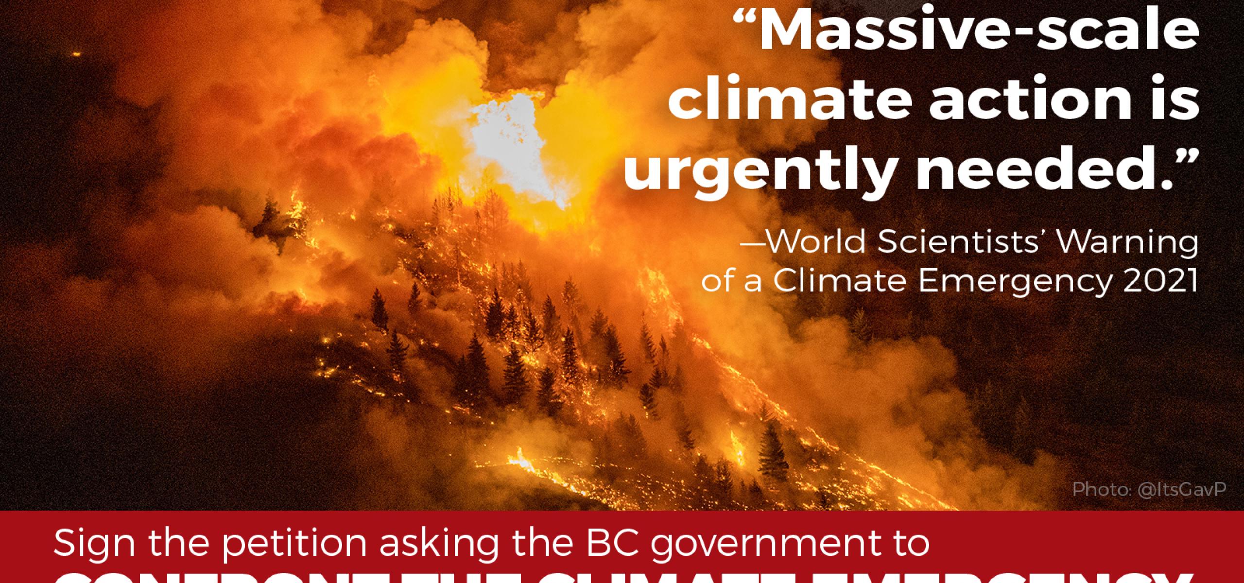 The latest report from the Intergovernmental Panel on Climate Change is a ‘code red’ for humanity. The International Energy Agency has called on world governments to immediately stop investments in and approvals of new oil and gas projects. The provincial government’s CleanBC climate action plan is insufficient to limit warming to 1.5°C and will not keep British Columbians safe from the worst impacts of climate change.
