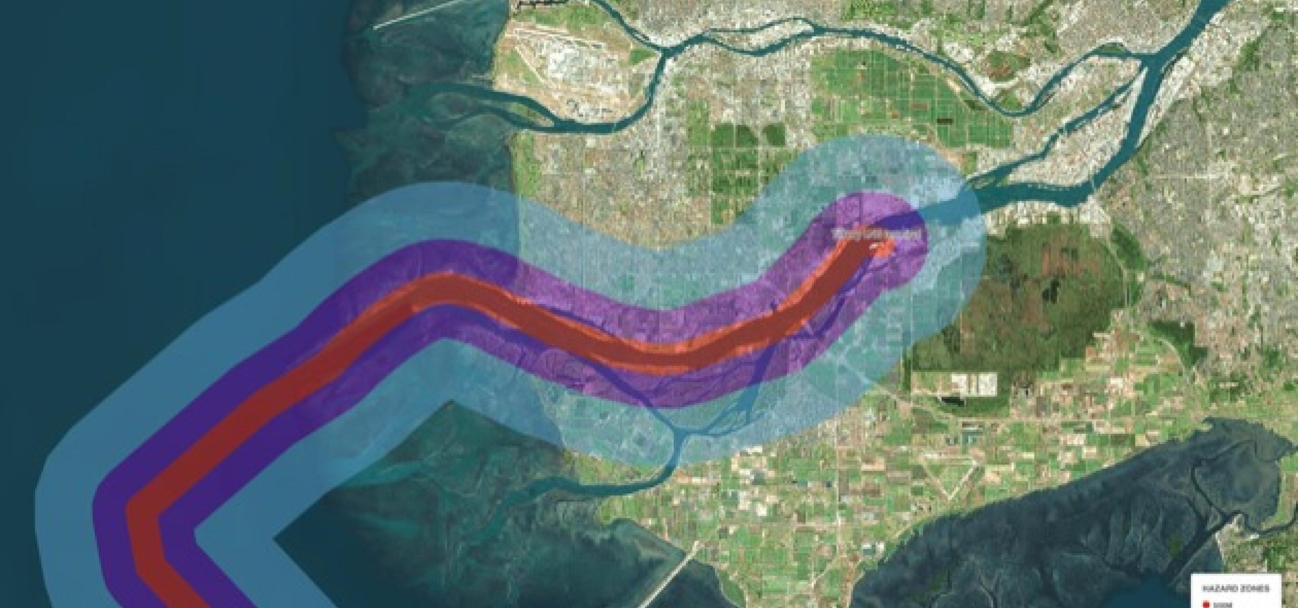 Zone 3 would extend up to 3.5 kilometres – which according to the map would encompass all of Steveston and much of Ladner – and is considered the maximum distance a cloud of escaped LNG vapour could drift without dispersing. If it ignited, the cloud could burn back to the tanker and result in a "pool fire."