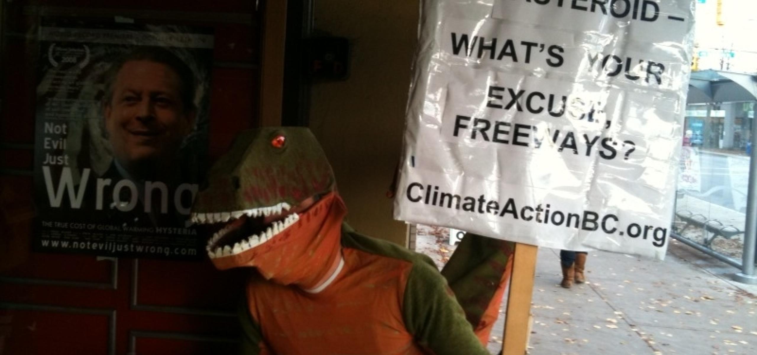 WHAT: T-Raax Jr. the dinosaur and Wilderness Committee campaigner Ben West will be on location promoting the International Day for Climate Action at the Fraser Institute’s Vancouver premier of the climate change denial film Not Evil Just Wrong.