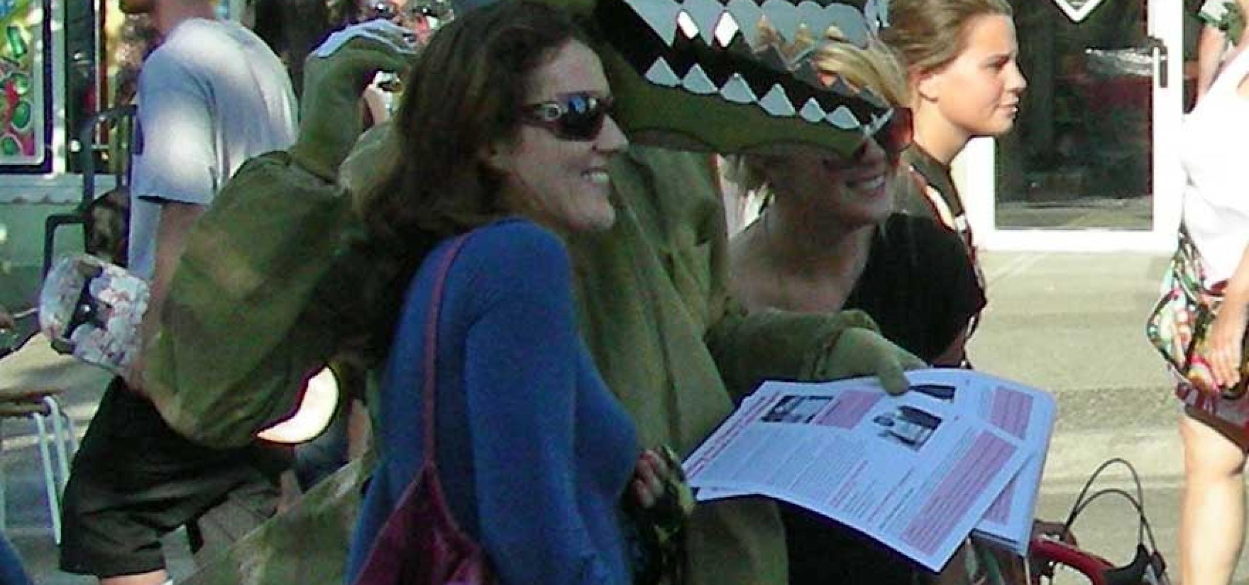 Later in the day, the Dinos visited the Wilderness Committee table at the Car Free festival on Commercial Drive in Vancouver and helped hand out campaign literature. Their key message: burning tar sands oil in your cars is cooking the planet, and new freeways are the fast track to extinction due to global warming.
