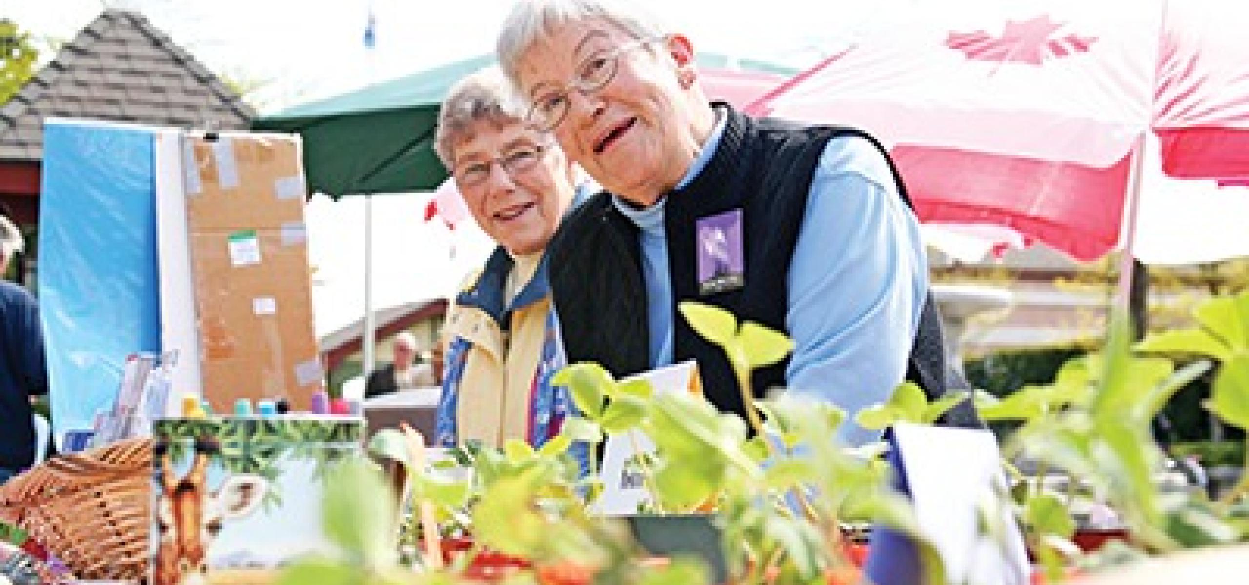 Photo: Kairos volunteers Juliana Ingrid Kratz, right, and Tess Cormack hand out free strawberry plants and other items at Earth Day celebrations in Qualicum Beach on Saturday.