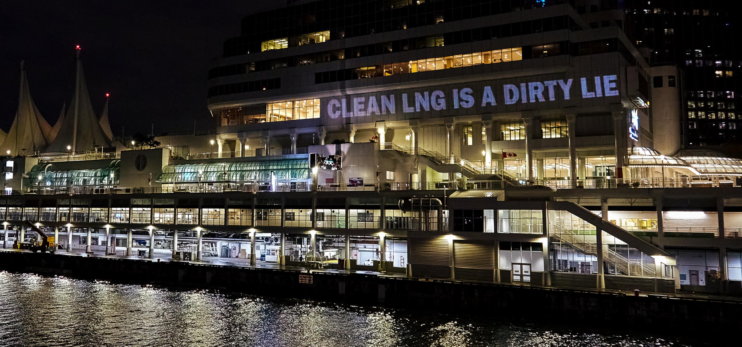 At Vancouver's Canada Place, climate groups project message denouncing companies and the government for promoting gas as a false climate solution