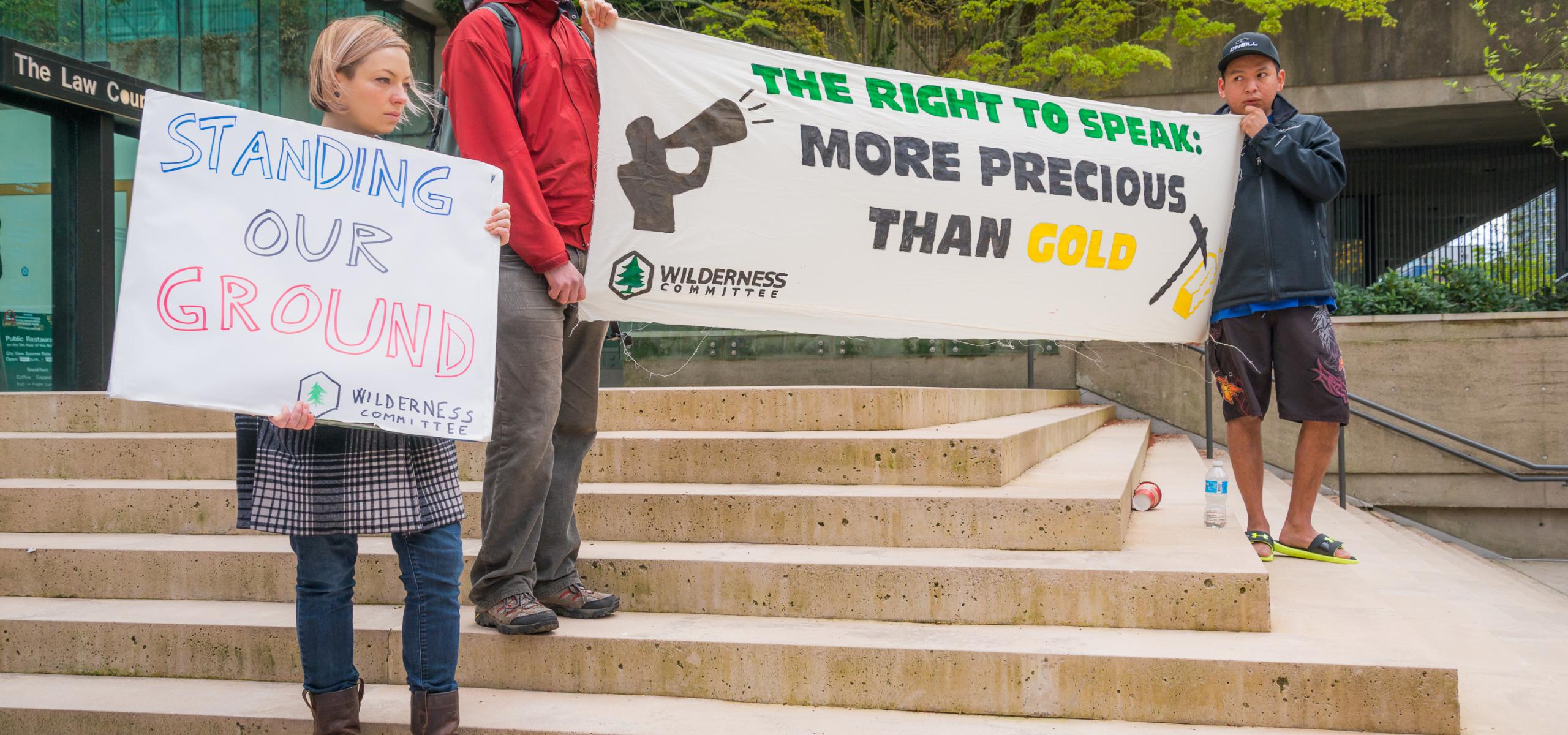 Photo: Wilderness Committee representatives and supporters outside the courthouse during Taseko Mines defamation lawsuit hearings. (WC Files)