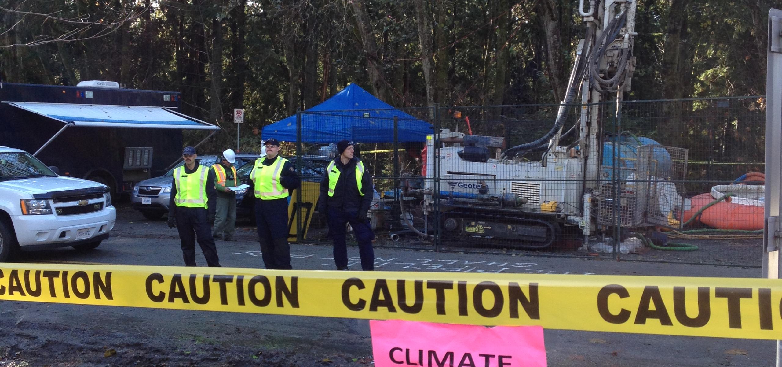 Photo: Protestors have been on Burnaby Mountain for weeks in opposition to the test drilling occurring there for Kinder Morgan's pipeline expansion project, which proposes to go through this conservation area. Kristin Henry.