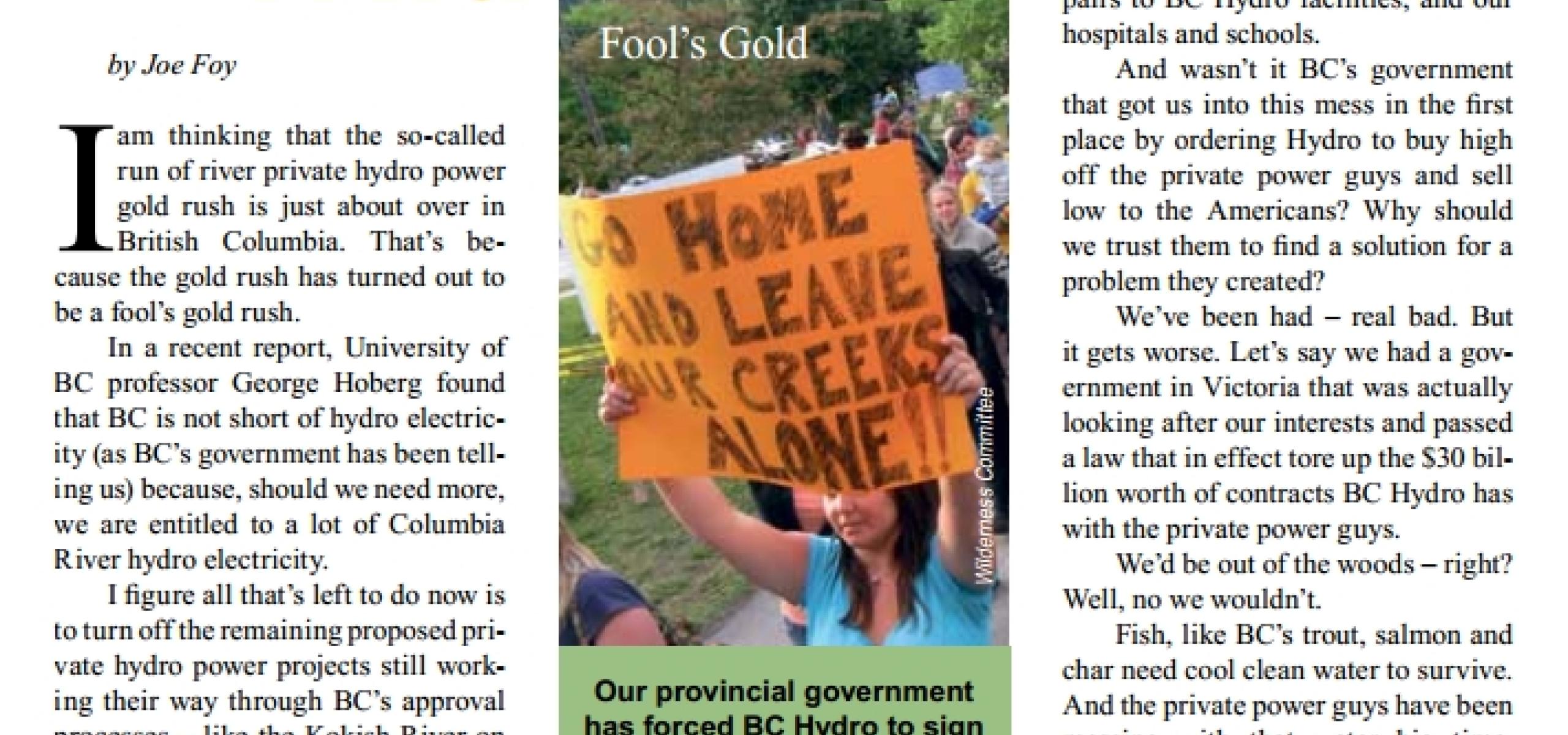 June 15th, 2011 - Read Joe Foy's Wild Times column in the Watershed Sentinel as he counts the costs of private hydro-power in BC.