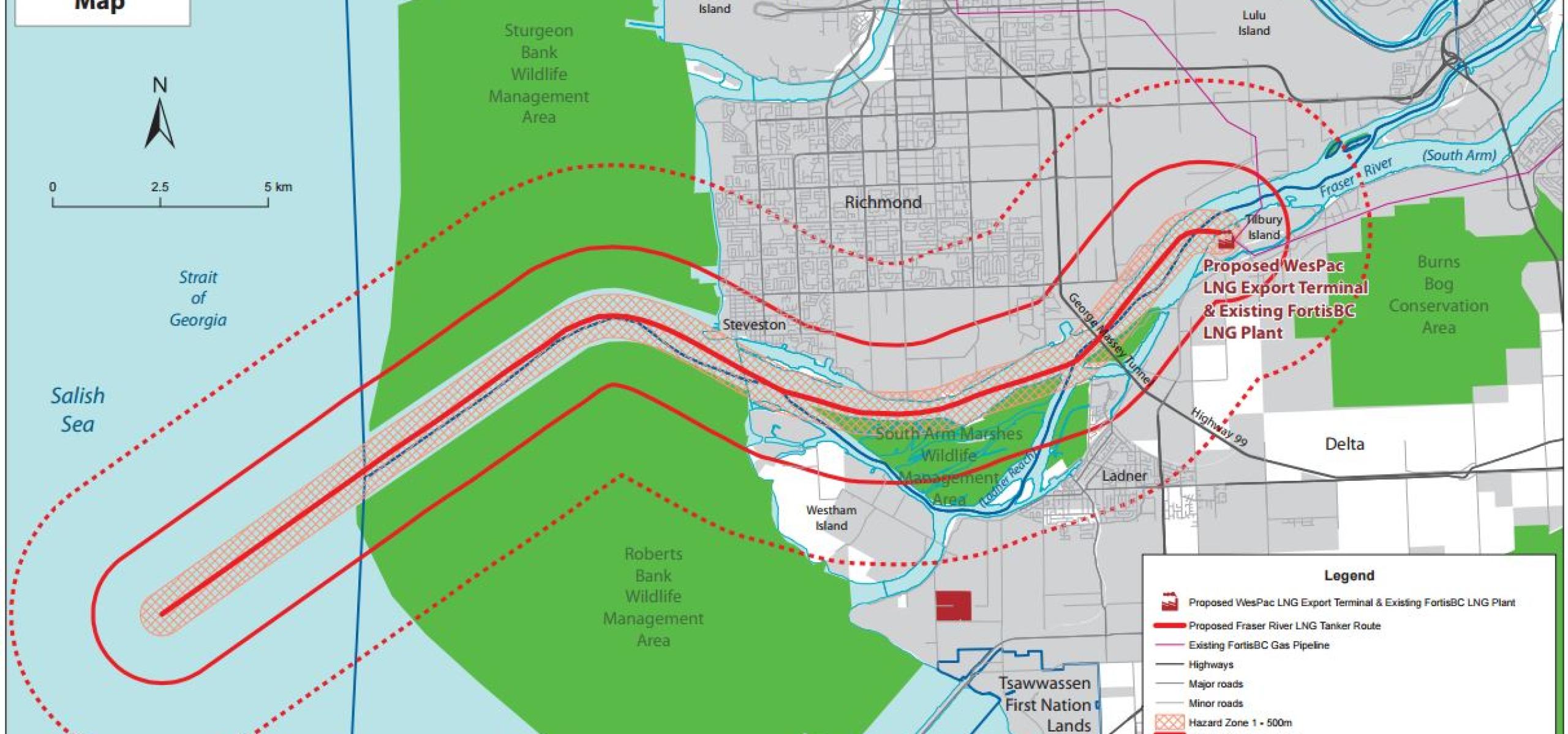 Map of proposed WesPac LNG tanker route and hazard zones on the Fraser River