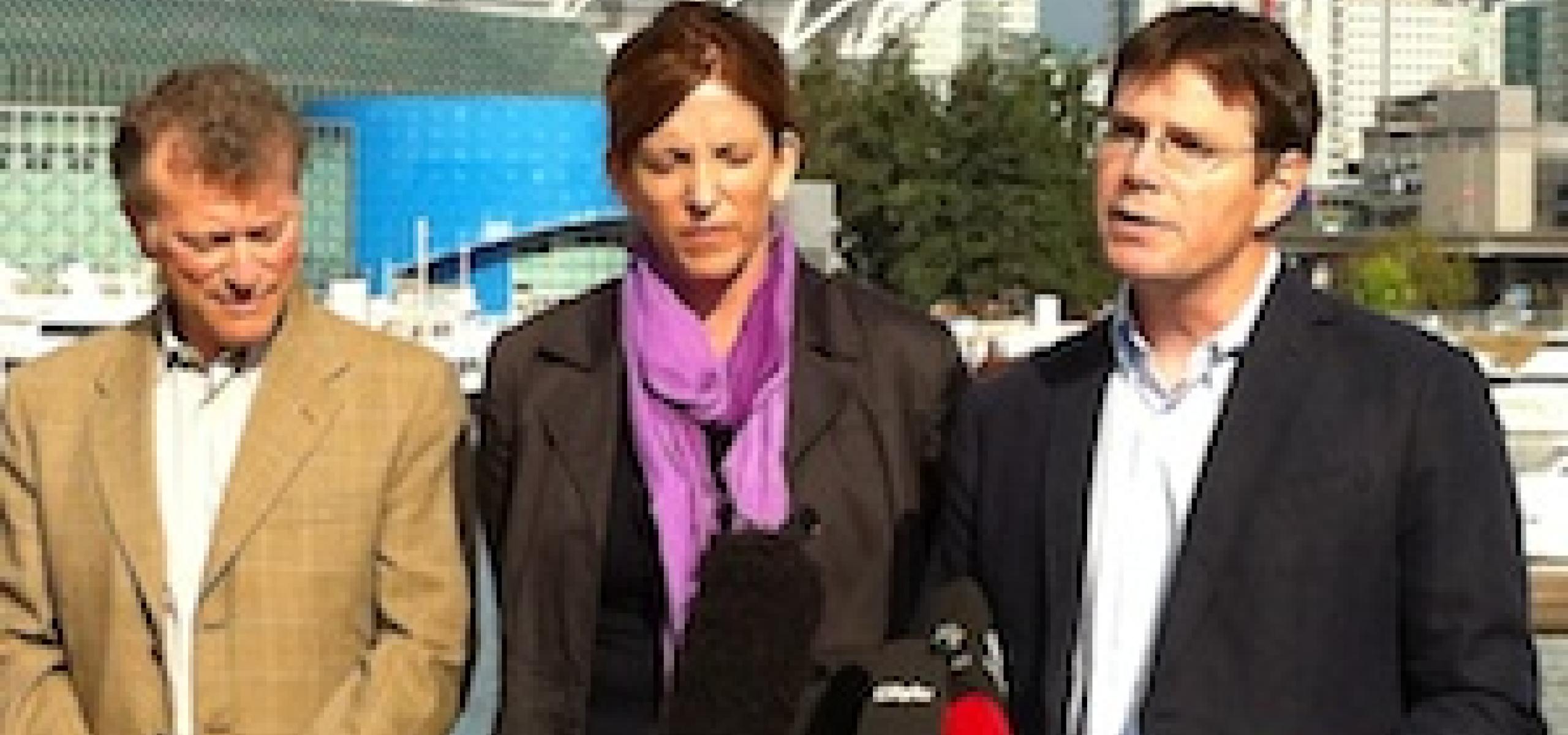 Photo: (L-R) Sierra Club BC Executive Director George Heyman, Wilderness Committee Policy Director Gwen Barlee and Ecojustice Lead Counsel Sean Nixon speak to press on Sept. 26. Photo by Alexis Stoymenoff.