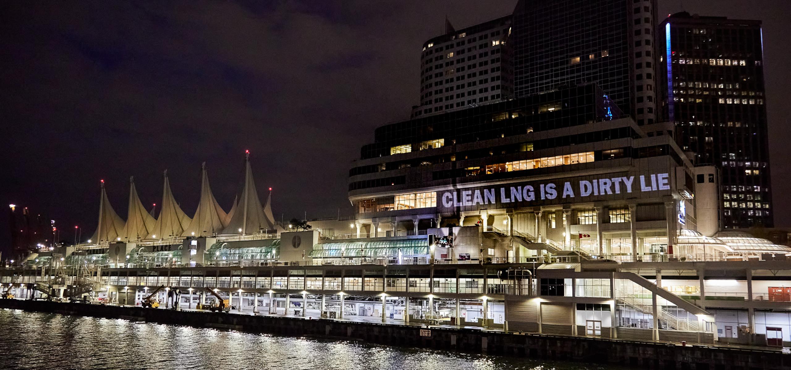 Before first light this morning, we set up a high-powered projector across the water from Vancouver’s iconic Canada Place convention center to send a message: Clean LNG is a dirty lie because fracking cannot be clean.