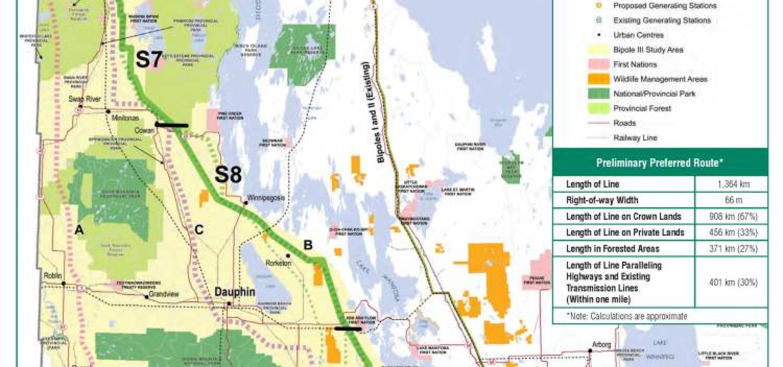 After months of public meetings on three possible routes, Hydro announced Thursday it had settled on one that runs from the dams in northeastern Manitoba, south of Thompson and The Pas, to the east of the Porcupine Forest Reserve and Duck Mountain Provincial Park and then along the western shores of Lake Manitoba. Near the town of St. Claude, it takes a sharp turn east and runs south of Niverville to Winnipeg's east side. Hydro says it's the shortest route with the least impact on agriculture. About a third of the 1,350-kilometre route will tower over private land.
