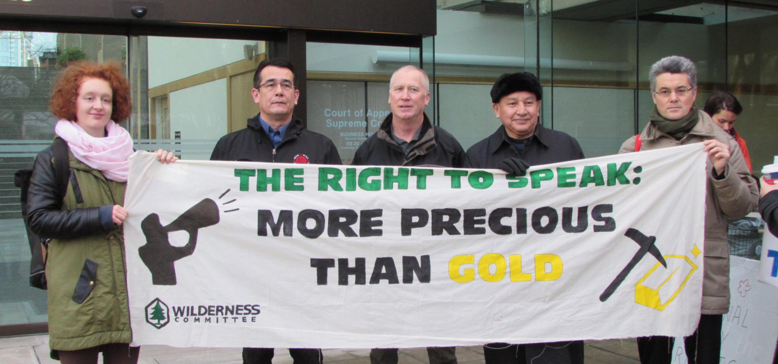 Supporters of the advocacy group stood on the downtown courthouse's steps and hoisted banners, displaying slogans such as "The right to speak: More precious than gold," and "Nature can't be silenced."