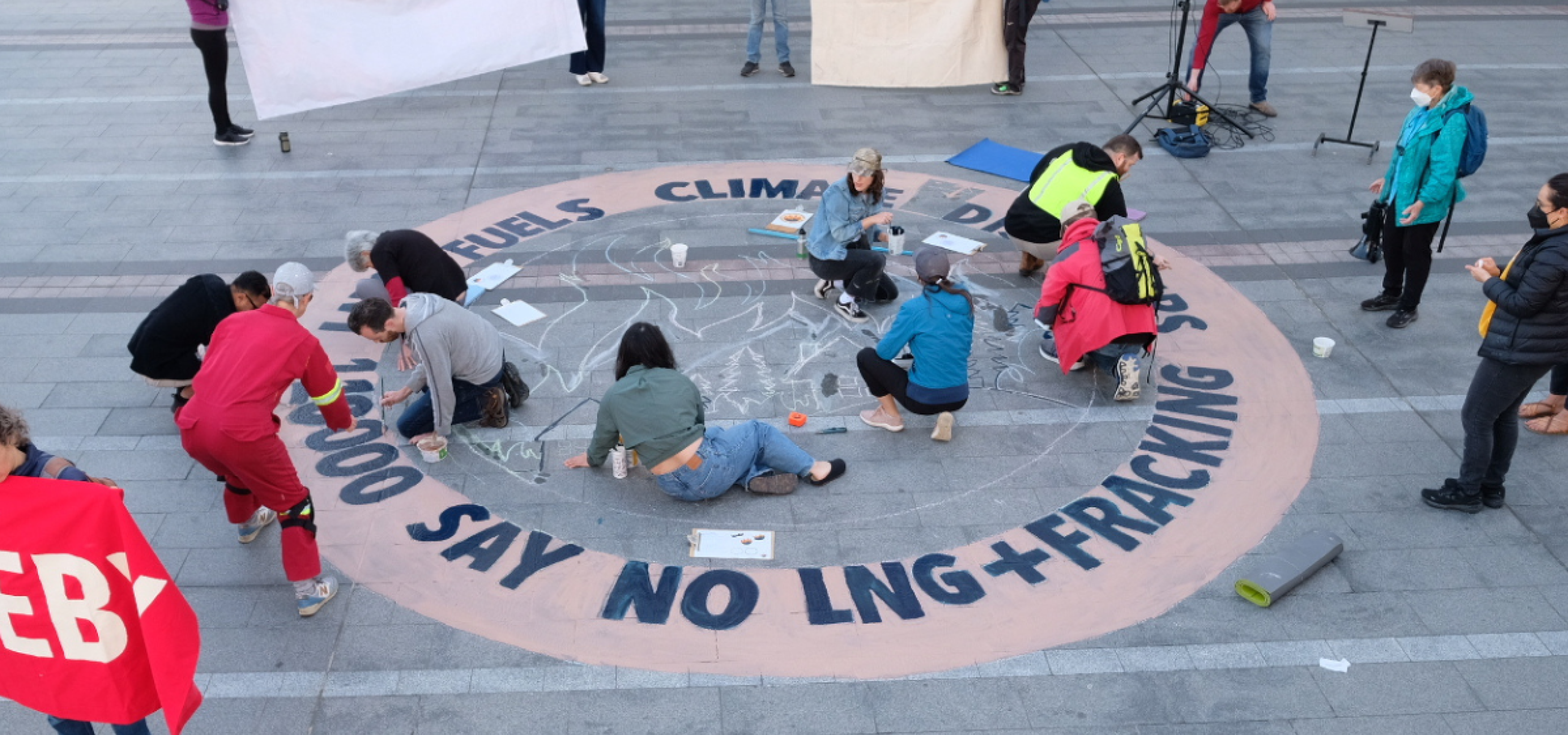 Prior to the press conference and petition delivery, activists painted a temporary mural at the same location to draw attention to the growing movement of opposition to fracking and LNG.