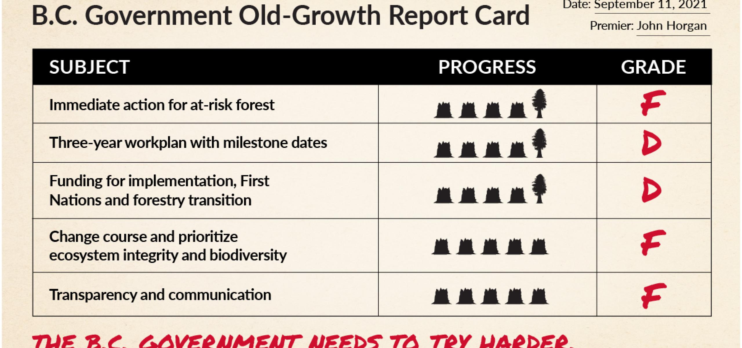 VICTORIA (Unceded Lekwungen Territories) — One year after the B.C. government shared its Old-Growth Strategic Review (OGSR) report and Premier John Horgan committed to implementing all of the panel’s recommendations, Ancient Forest Alliance, Sierra Club BC and Wilderness Committee have released a report card assessing the province’s progress on their promise to protect old-growth forests.