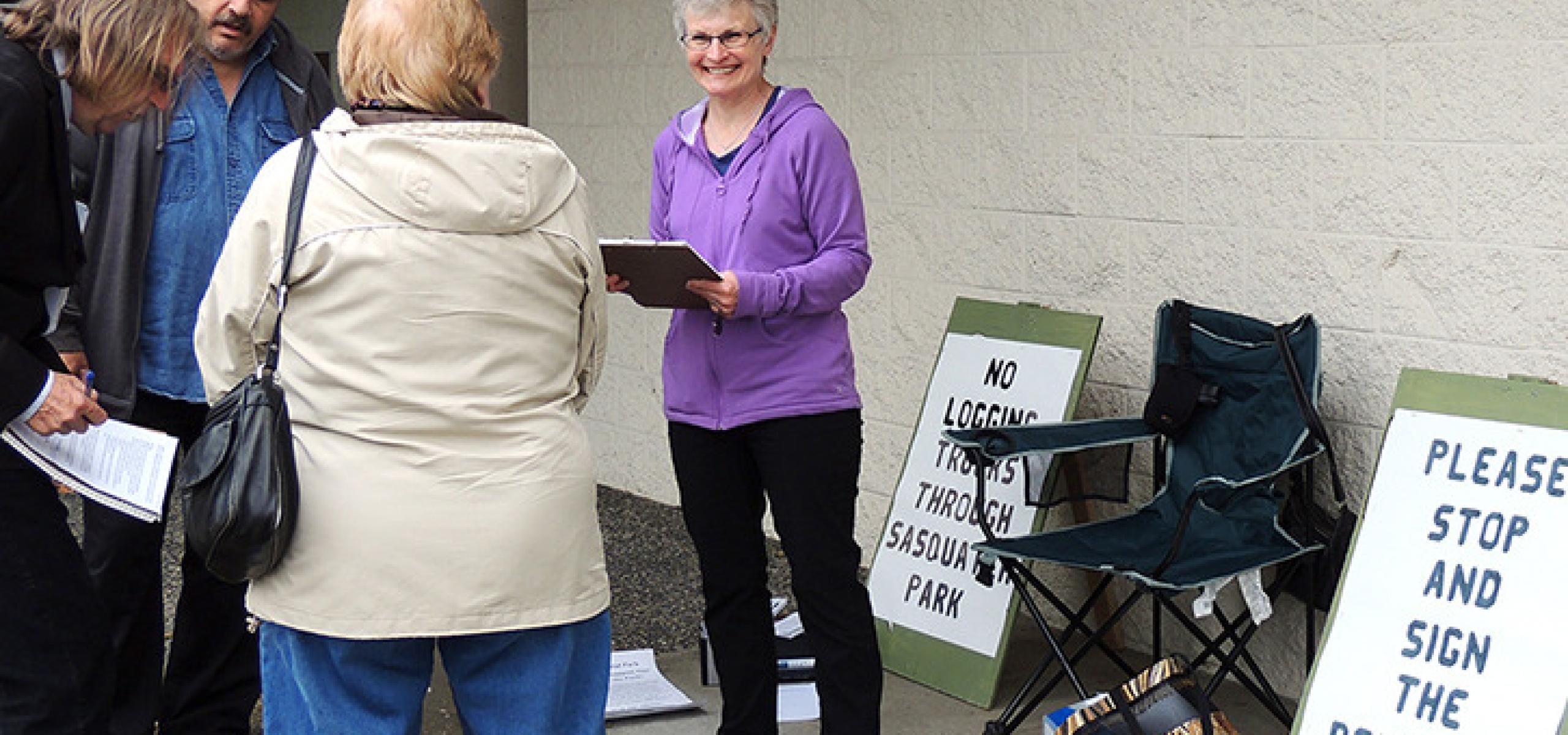 Photo: Opposition to the plan to remove a road from the Sasquatch Park boundaries gathered signatures outside a public meetings on Thursday.