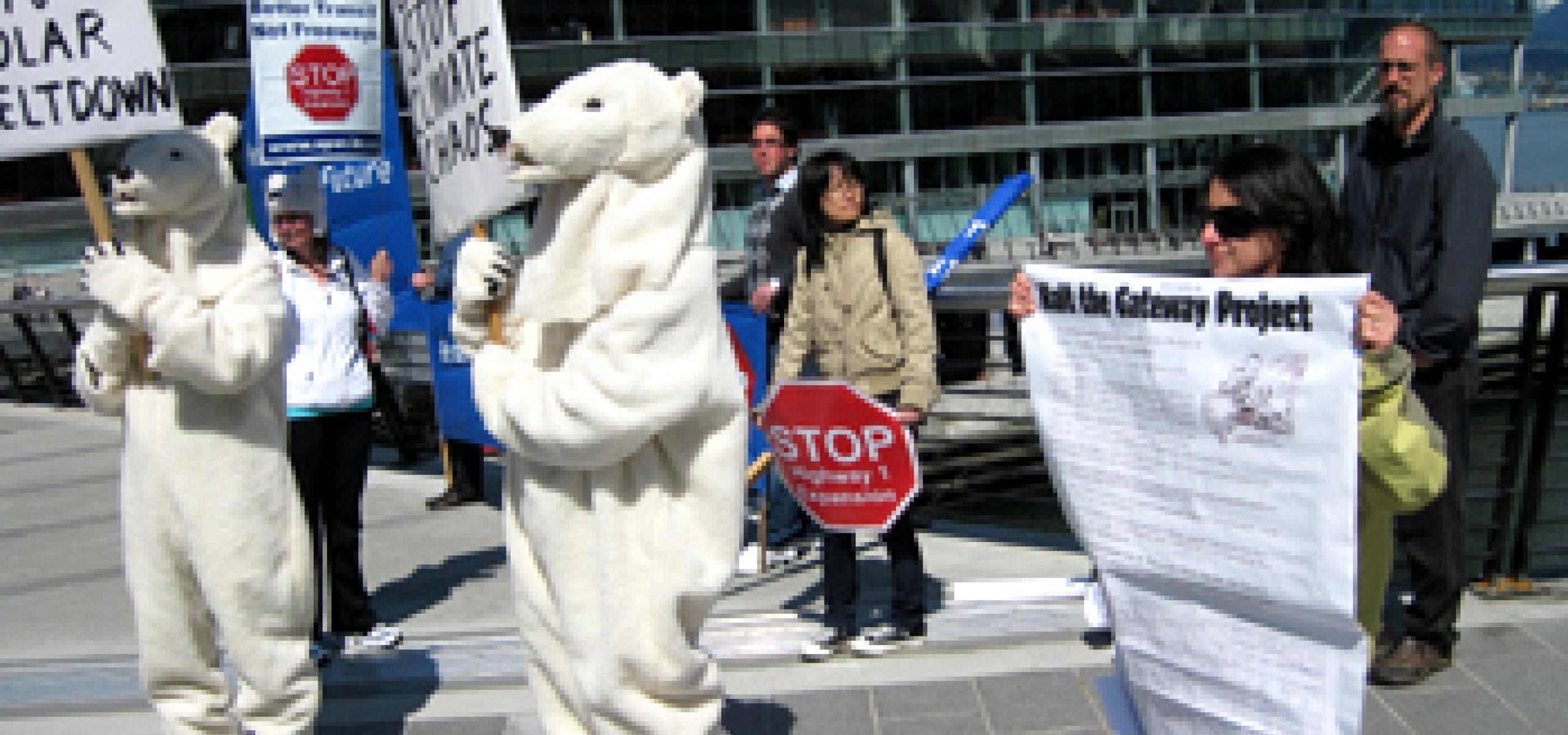The polar bears will highlight concerns about what activists are calling the "Gateway to global warming". "It will be virtually impossible to reach BCs commitments to reduce greenhouse gases (GHGs) if Gateway is allowed to proceed. Gateway is not just an irresponsible plan, its immoral," said Ben West, the Wilderness Committees Healthy Communities Campaigner.