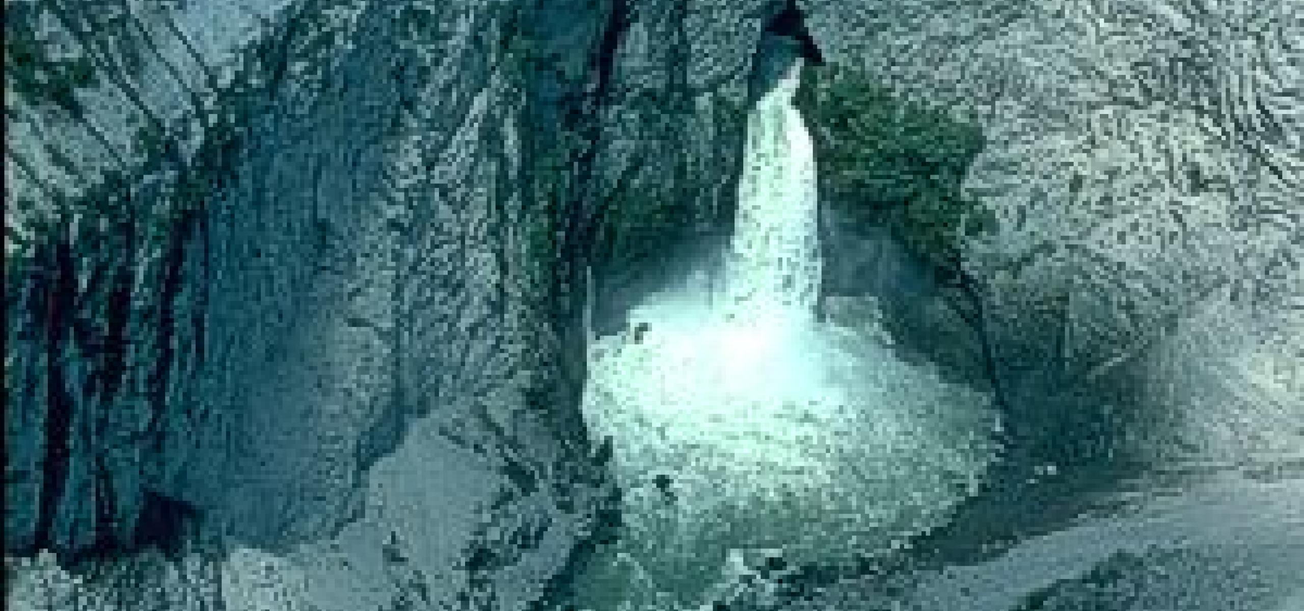 Keyhole Falls, located about 60 kilometres northwest of Pemberton, is where the Lillooet River bursts forth from the volcanic rubble of Mount Meager's last eruption almost 2,400 years ago.