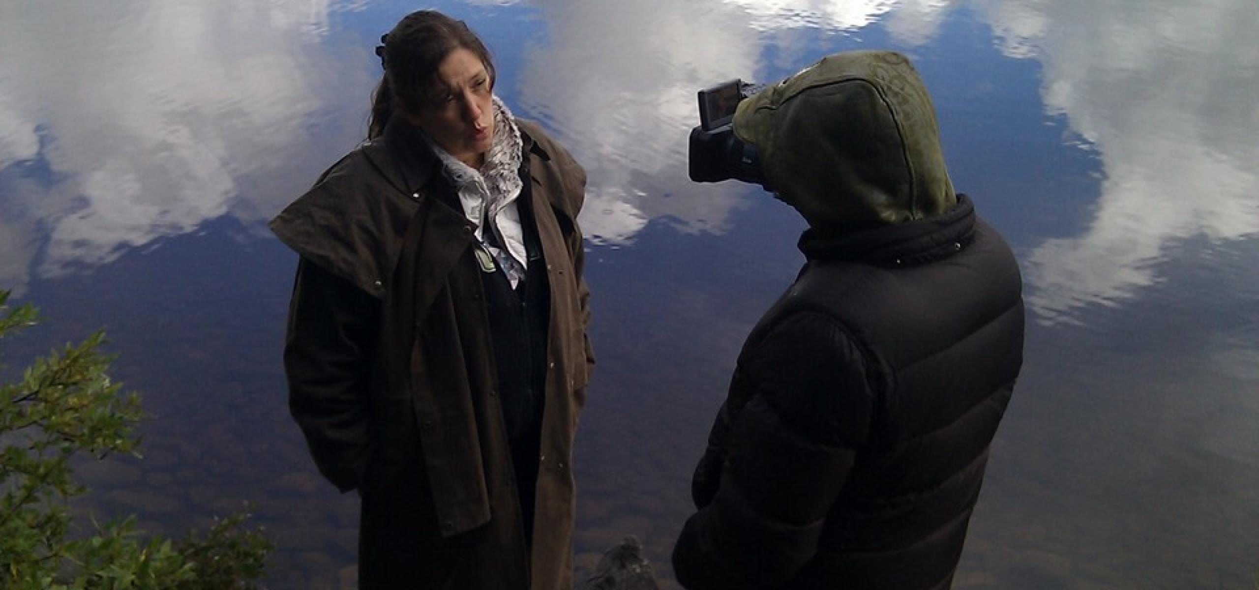 Photo: Chief Marilyn Baptiste being interviewed on the shore of Fish Lake.