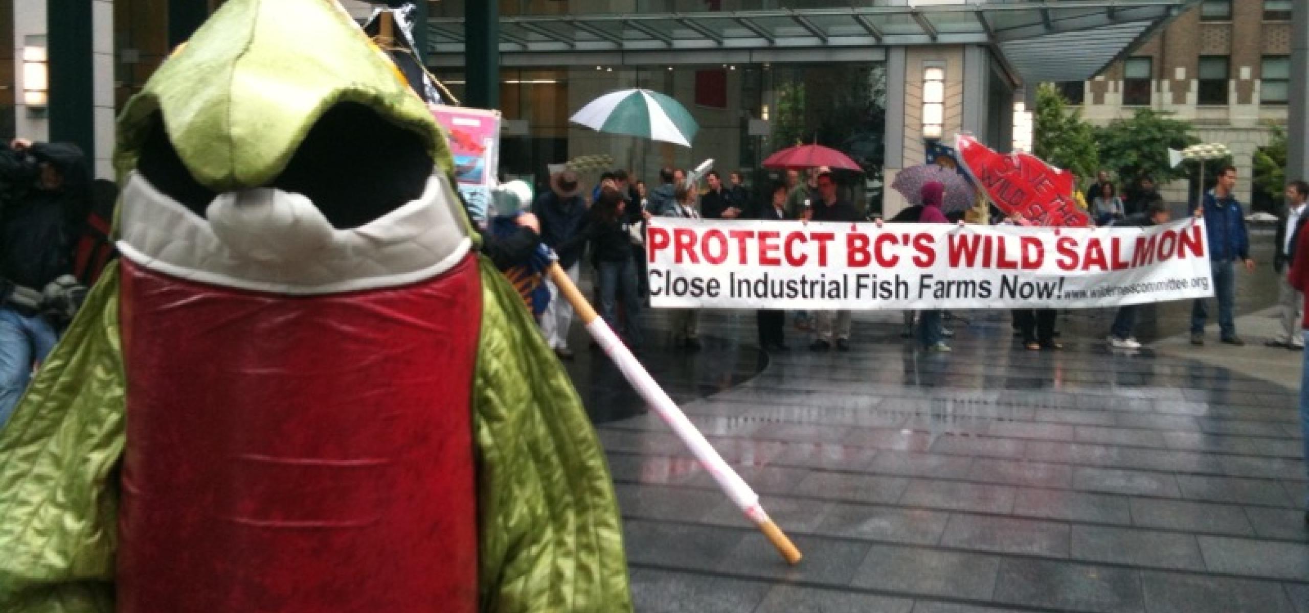 People dressed as fish and a new group called the Wild Salmon Circle were joined by broadcaster Rafe Mair at a protest yesterday outside the federal fisheries offices in Vancouver.