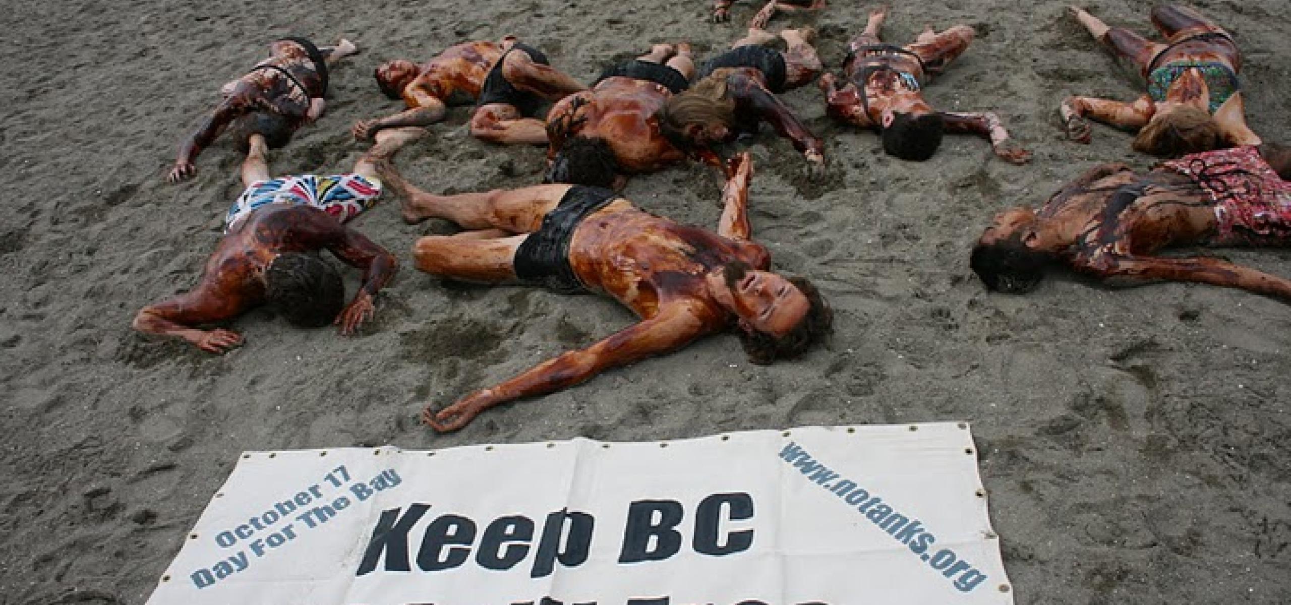 Monday, October 11, 2010Anti-oil protesters staged a slick protest in Vancouver's English Bay Monday, dousing themselves in fake oil before staging a "die-in" to protest oil tanker traffic in Burrard Inlet.