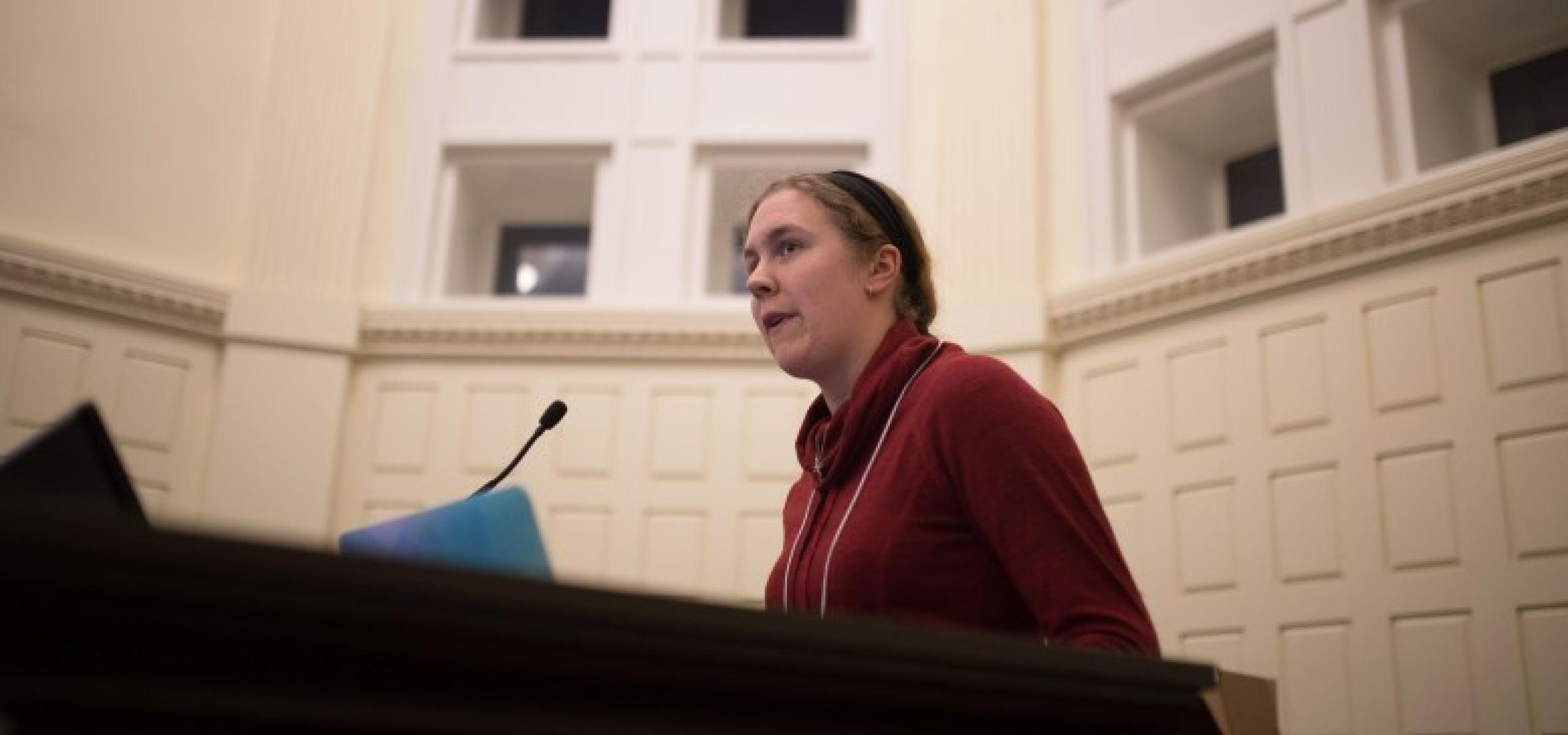 Teresa Looy, Compost Program Coordinator at the Green Action Centre, speaks to a full house at the town hall on climate action. PHOTO: Jen Doerksen