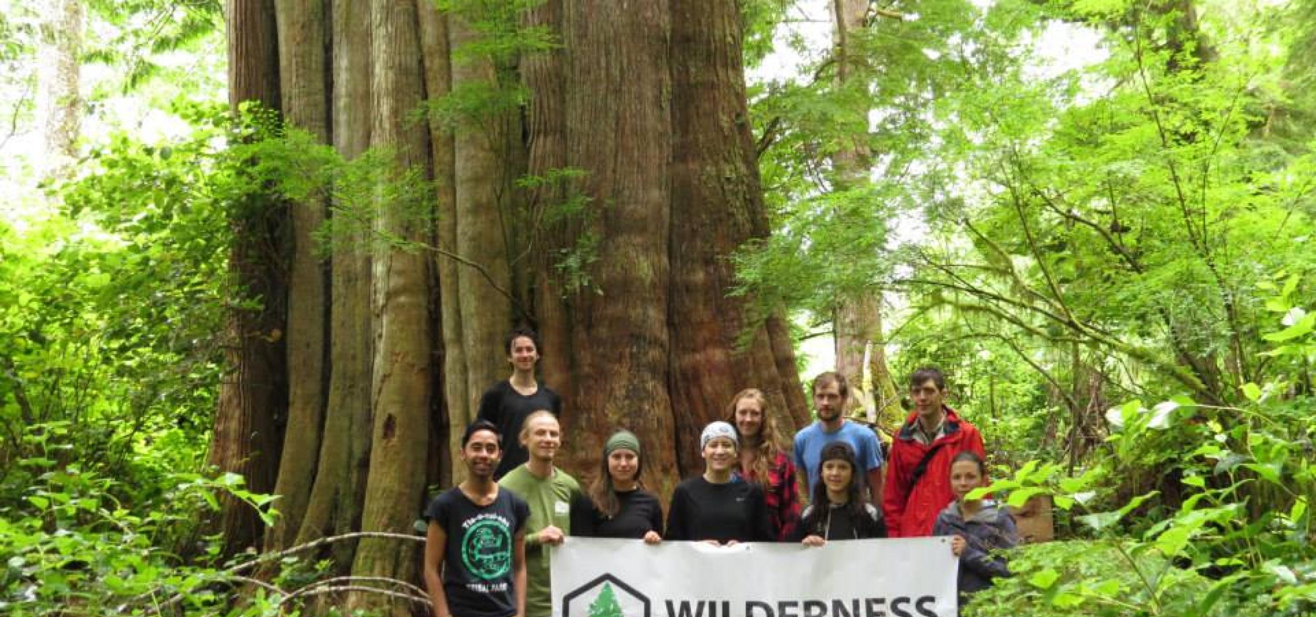 Wilderness Committee volunteer crew with old-growth red cedar tree in Wah-nuh-jus–Hilthoois Tribal Park.