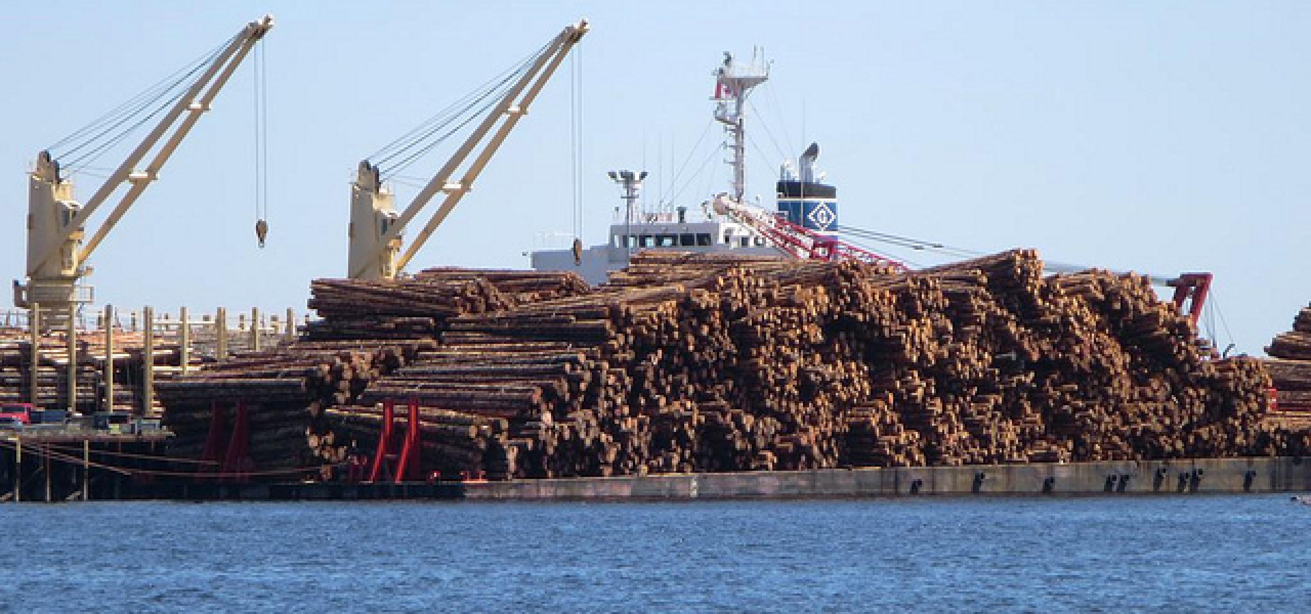 Photo: Raw logs and local sawmill jobs are exported to Asia from the Assembly Wharf at Nanaimo, British Columbia, Canada. David Stanley via Flickr.