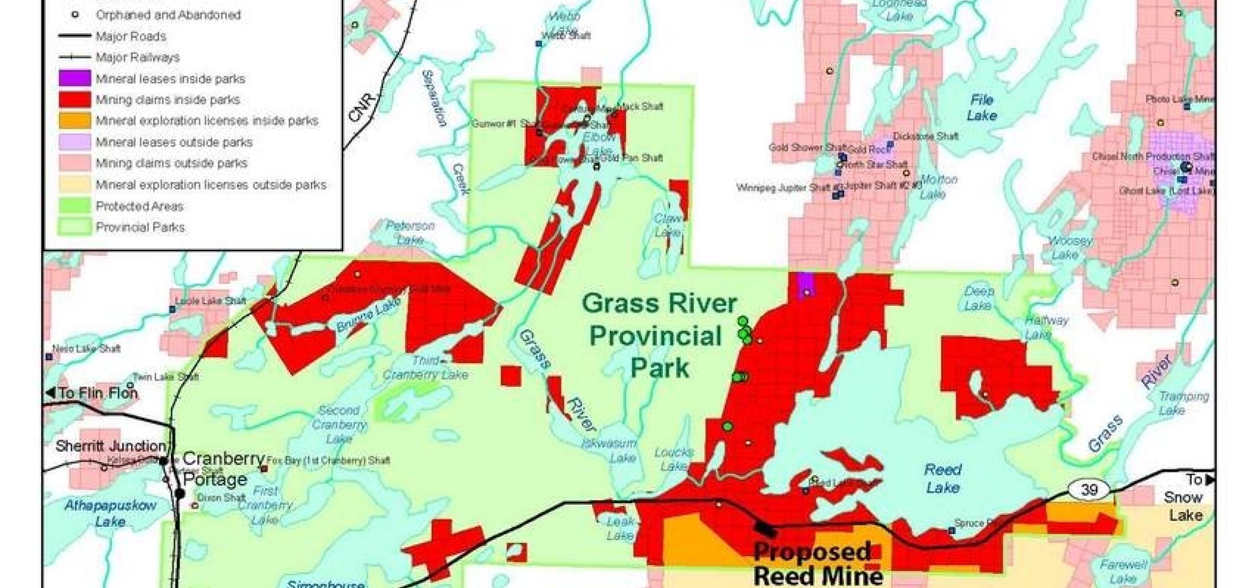 Photo: A Wilderness Committee map shows the extent of mineral leases, mining claims and mining exploration licenses within Grass River Provincial Park. The environmental organization is unhappy that the provincial government has approved Hudbay’s application to operate the Reed Mine copper project just to the south of Highway 39 with the park’s boundaries.