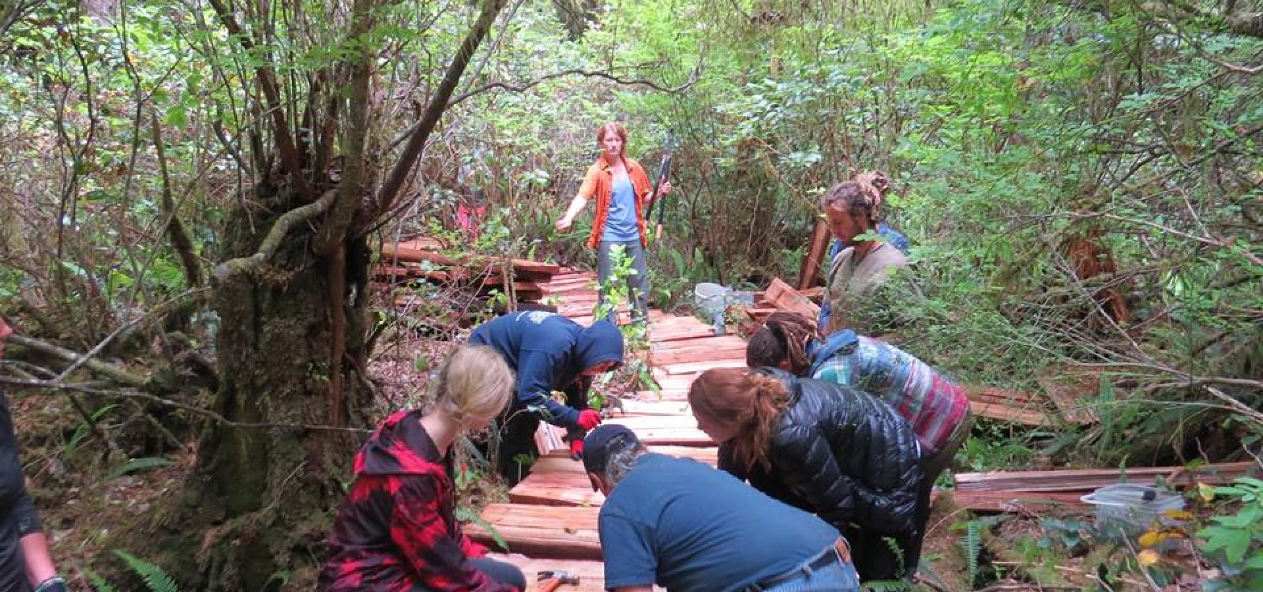 On two trips to Wah-nuh-jus—Hilthoois (Meares Island) Tribal Park in Clayoquot Sound our volunteers repaired and upgraded the legendary Big Tree Trail boardwalk, near Tofino. This trail is part of the world-class ecotourism infrastructure in Tla-o-qui-aht territory, and the Tribal Park it sits within was declared and protected by the Tla-o-qui-aht Nation more than 30 years ago. Wah-nuh-jus—Hilthoois was one of the first tribal parks declared in North America, and since then, the Tla-o-qui-aht have declared three other Tribal Parks in the rest of its territory.