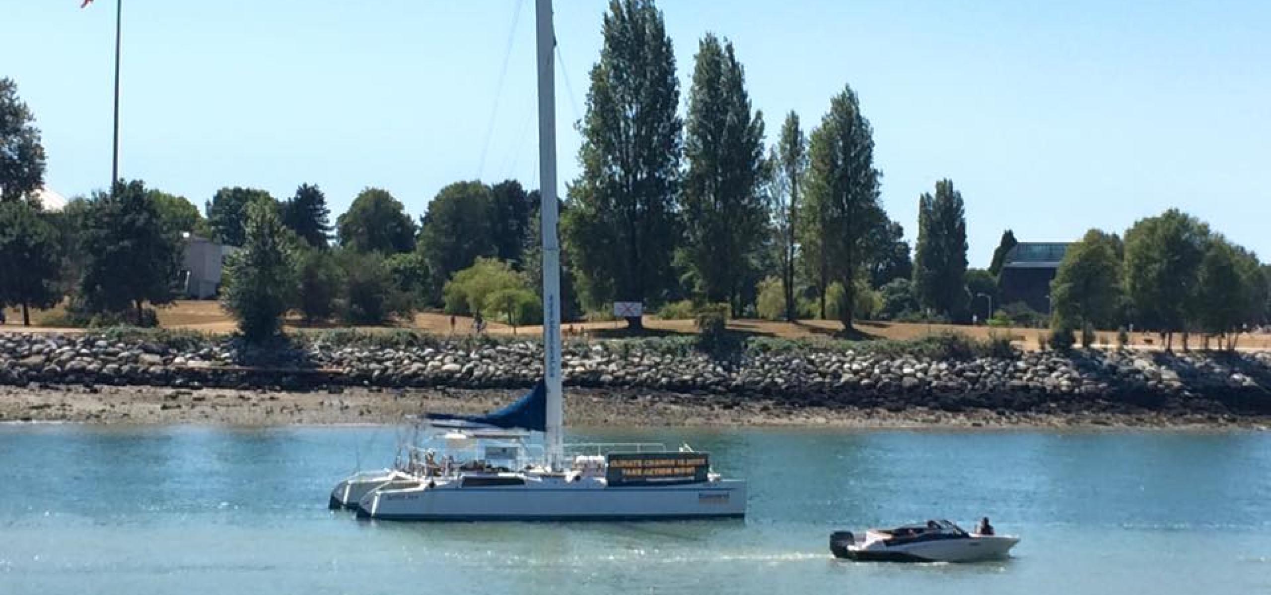 This afternoon, the catamaran will travel to Vancouver’s Sunset Beach, to stand in solidarity with the We > Tar Sands: Action for Jobs, Justice and the Climate event.