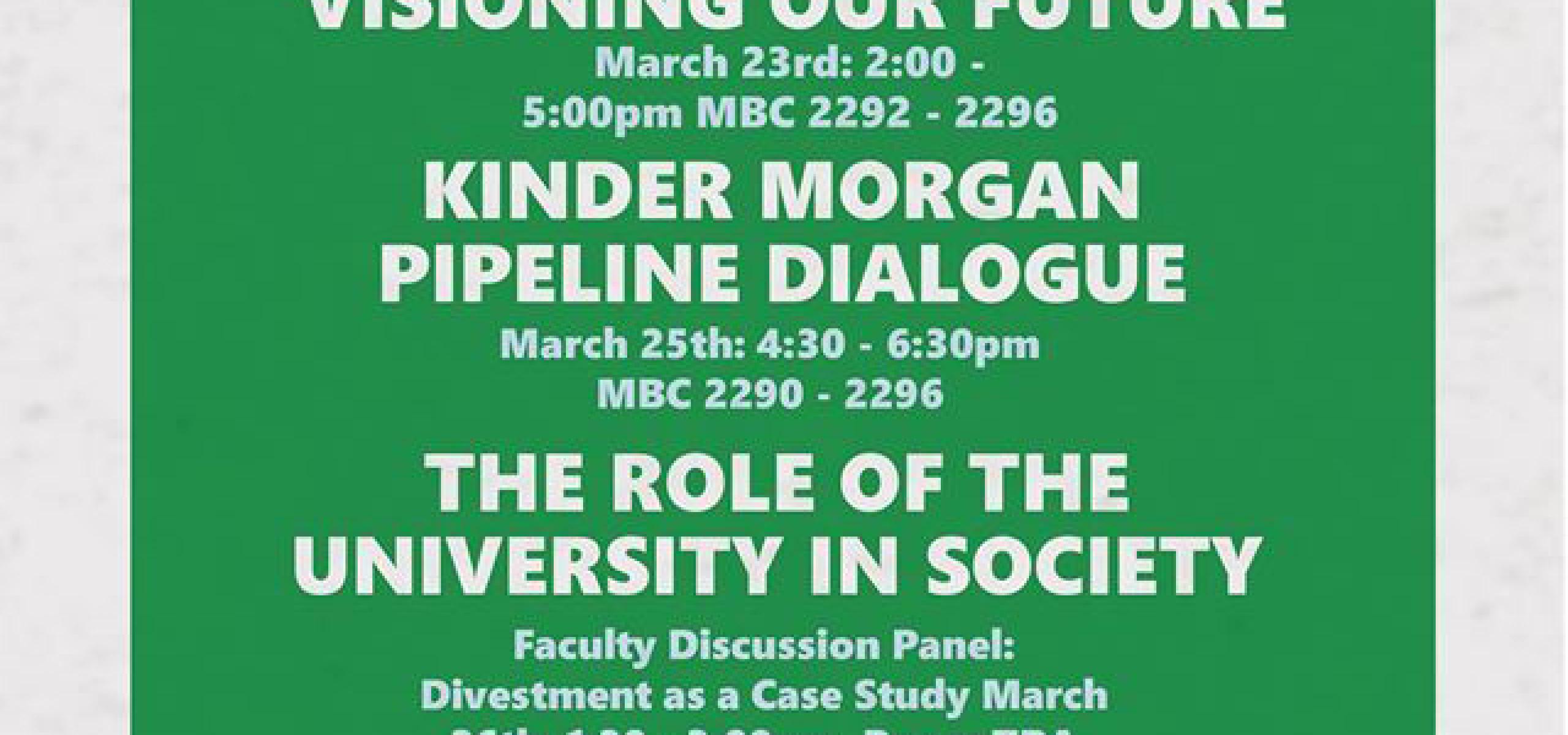 "The SFU community needs to dialogue about important, relevant issues like divestment, the relationship between climate change and health and the Kinder Morgan pipeline expansion project. In the absence of consultation from Kinder Morgan or the university, student leaders are stepping up to create the space for these conversations for other students and the SFU community," said Tesicca Truong, the SFSS Environment Representative.