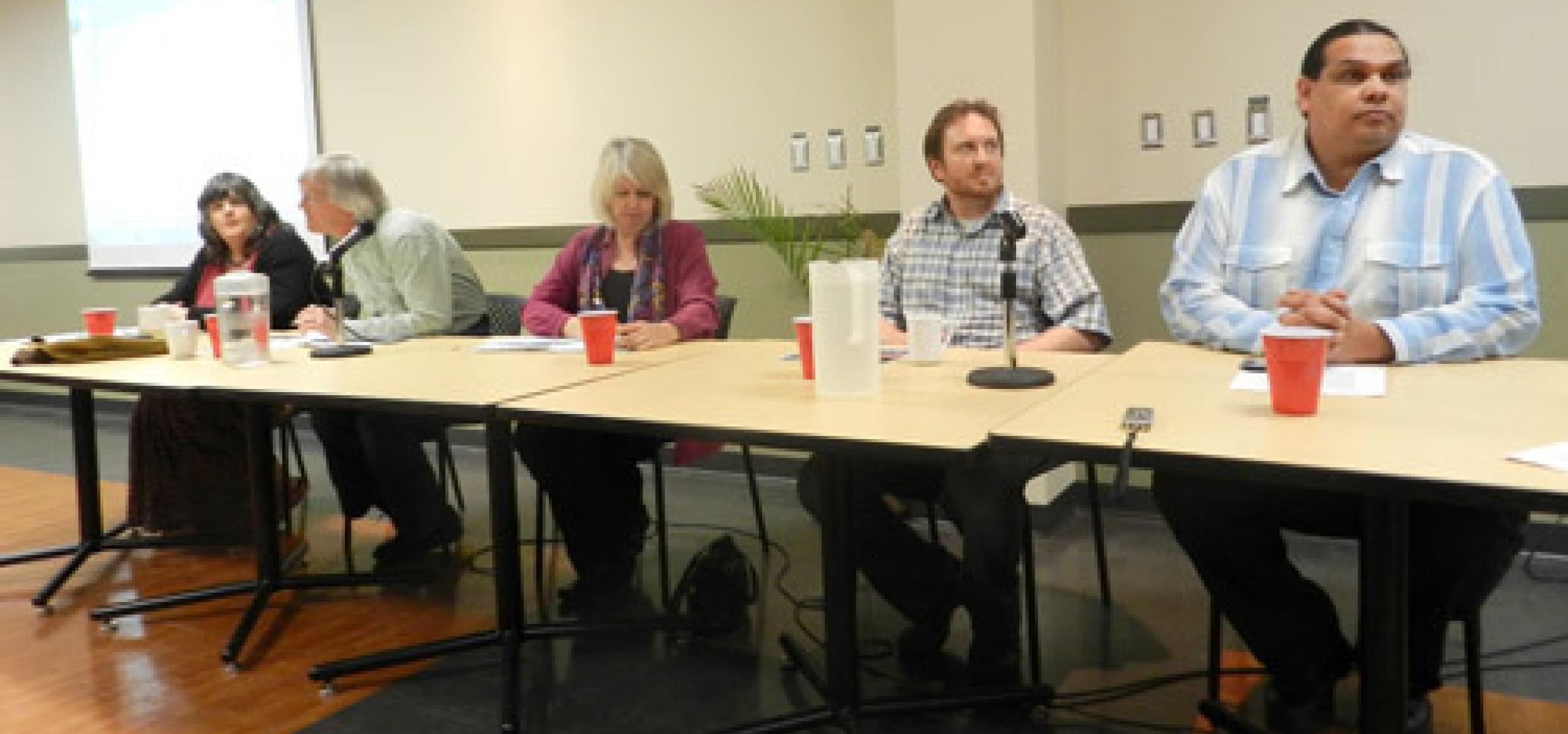 Photo: (From left) Mary Forstbauer, John Vissers, Adriane Carr, Ben West and Rueben George were the panelists at a public information meeting about Kinder Morgan's proposed expansion of the Trans Mountain Pipeline. The meeting took place Wednesday, April 11 at University of the Fraser Valley in Abbotsford.