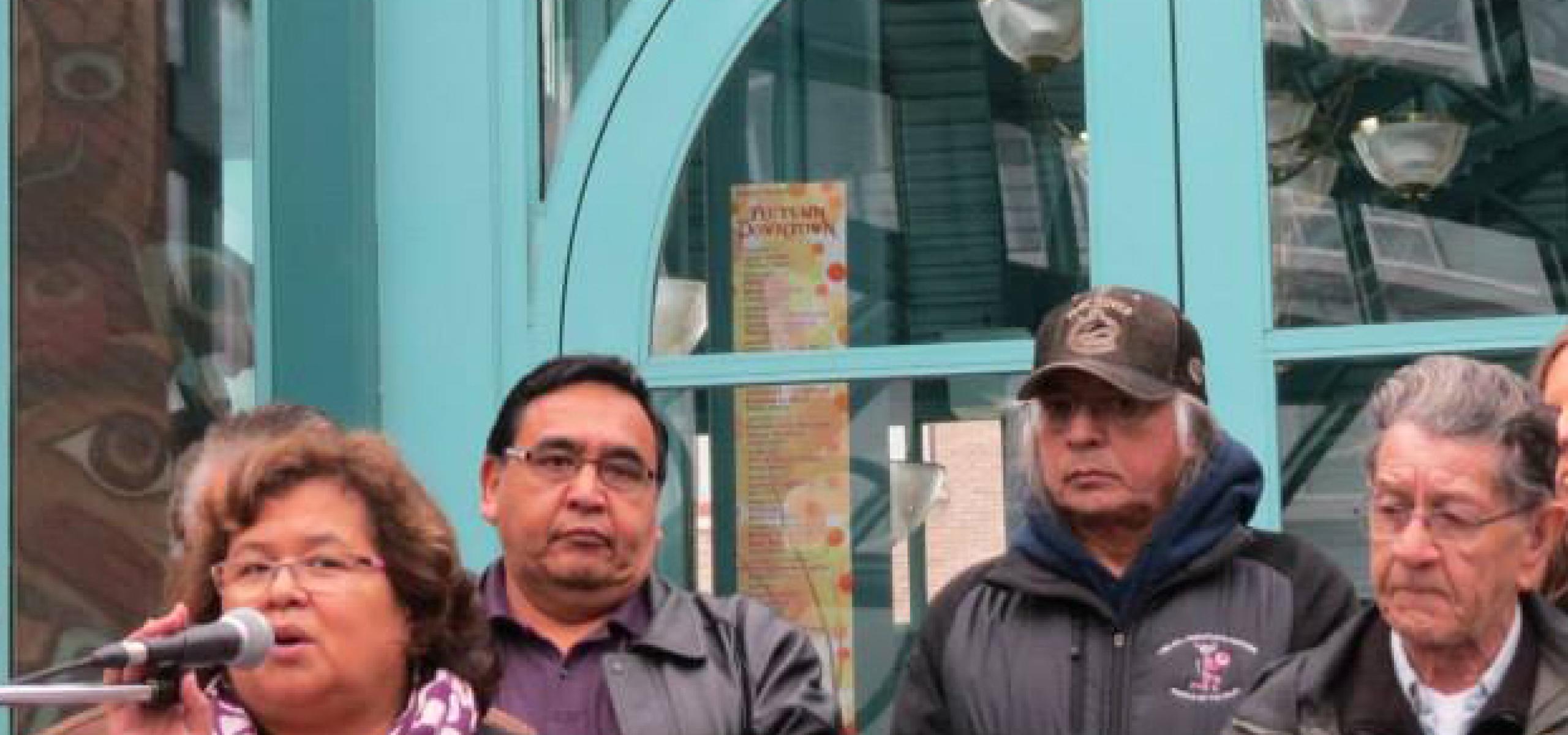 Photo: First Nations representatives speak at a rally in the midst of NEB hearings in Victoria, BC (Emily Hoffpauir).