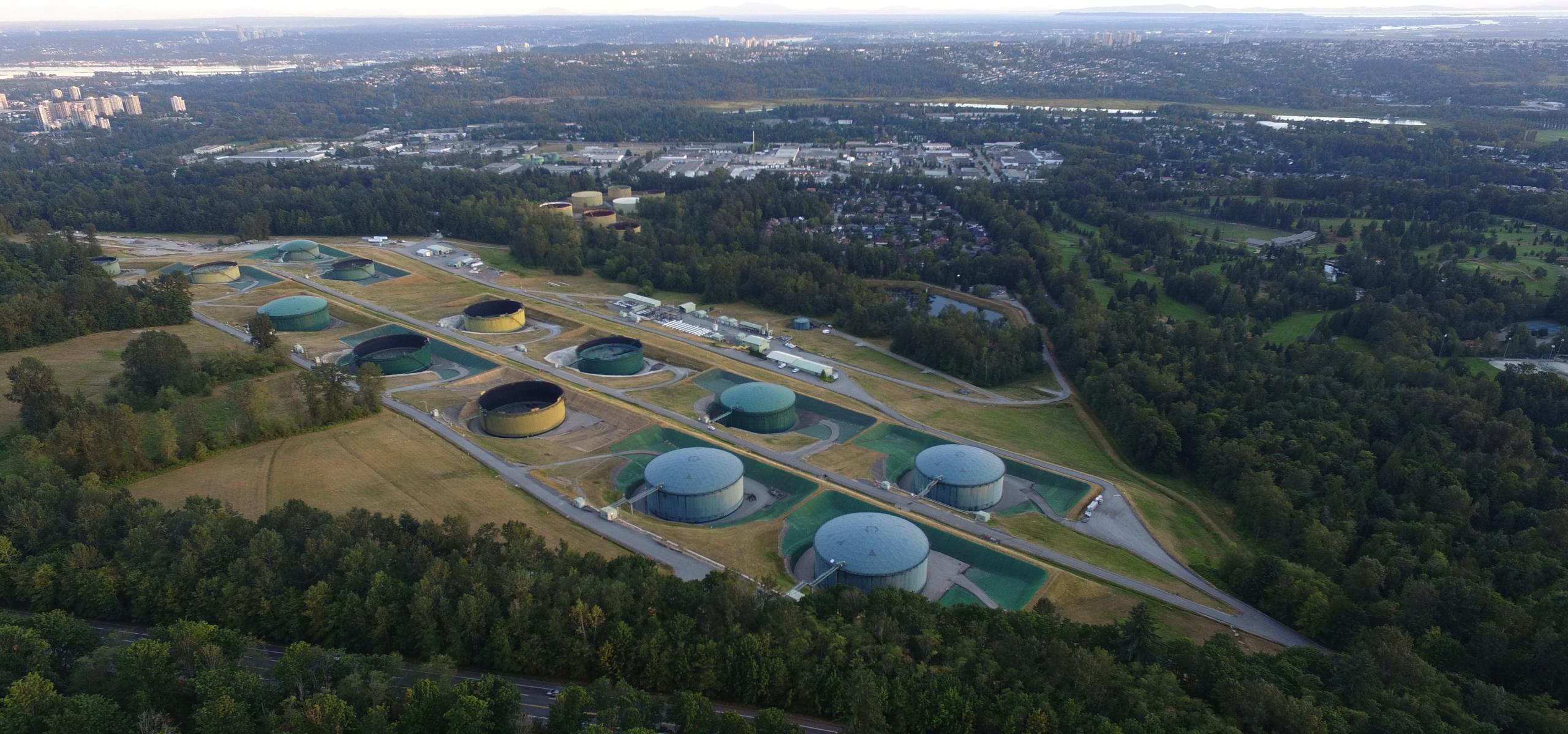 An environmental protection trailer is parked at Kinder Morgan's crude oil tank farm on Burnaby Mountain near Simon Fraser University in Burnaby, B.C.