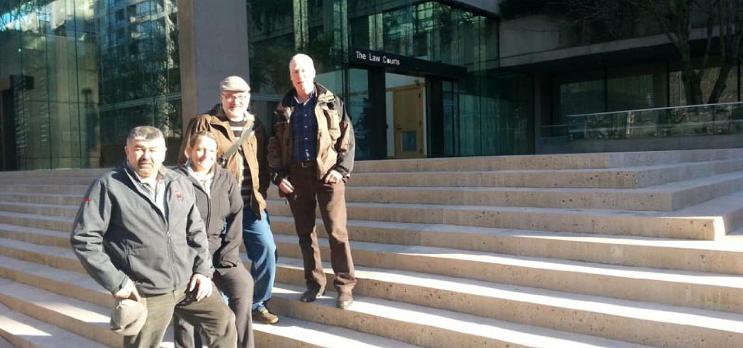 Photo: Chief Alphonse, Beth Clarke (Development and Program Director for Wilderness Committee), Sven Biggs (Former Outreach Director for Wilderness Committee), and Joe Foy (National Campaign Director for Wilderness Committee) on steps of BC Supreme Court. Credit Tsilhqot'in National Government.